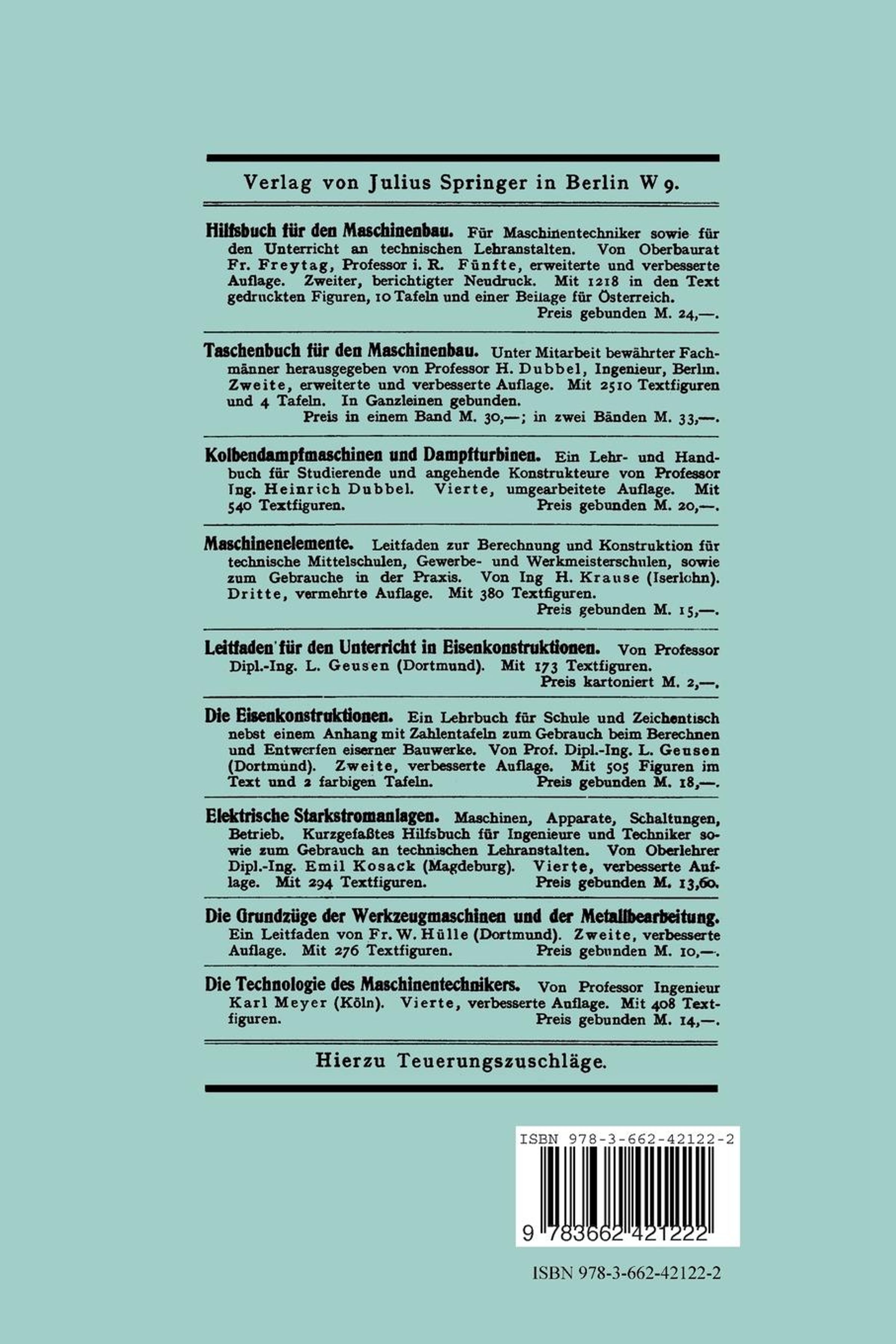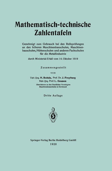 • Genehmigt zum Gebrauch bei den Reifeprüfungen an den höheren Maschinenbauschulen, Maschinen-bauschulen, Hüttenschulen und anderen Fachschulen für die Metallindustrie durch Ministerial-Erlaß vom 14. Oktober 1919