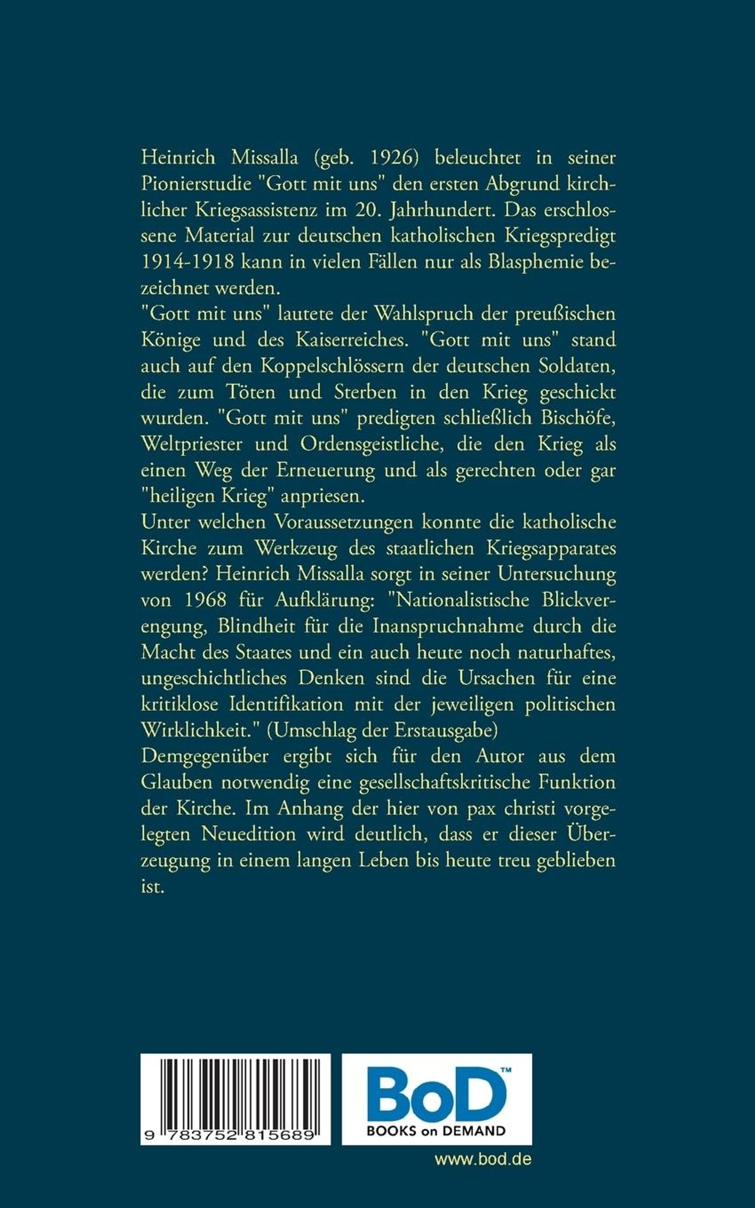 Heinrich Missalla (geb. 1926) beleuchtet in seiner Pionierstudie "Gott mit uns" den ersten Abgrund kirchlicher Kriegsassistenz im 20. Jahrhundert. Das erschlossene Material zur deutschen katholischen Kriegspredigt 1914-1918 kann in vielen Fällen nur als Blasphemie bezeichnet werden. "Gott mit uns" lautete der Wahlspruch der preußischen Könige und des Kaiserreiches. "Gott mit uns" stand auch auf den Koppelschlössern der deutschen Soldaten, die zum Töten und Sterben in den Krieg geschickt wurden. "Gott mit uns" predigten schließlich Bischöfe, Weltpriester und Ordensgeistliche, die den Krieg als einen Weg der Erneuerung und als "heiligen Krieg" anpriesen. Unter welchen Voraussetzungen konnte die katholische Kirche zum Werkzeug des staatlichen Kriegsapparates werden? Missalla sorgt in seiner Untersuchung von 1968 für Aufklärung: "Nationalistische Blickverengung, Blindheit für die Inanspruchnahme durch die Macht des Staates und ein auch heute noch naturhaftes, ungeschichtliches Denken sind die Ursachen für eine kritiklose Identifikation mit der jeweiligen politischen Wirklichkeit." (Umschlag der Erstausgabe) Demgegenüber ergibt sich für den Autor aus dem Glauben notwendig eine gesellschaftskritische Funktion der Kirche. Im Anhang der von pax christi vorgelegten Neuedition wird deutlich, dass er dieser Überzeugung in einem langen Leben bis heute treu geblieben ist.