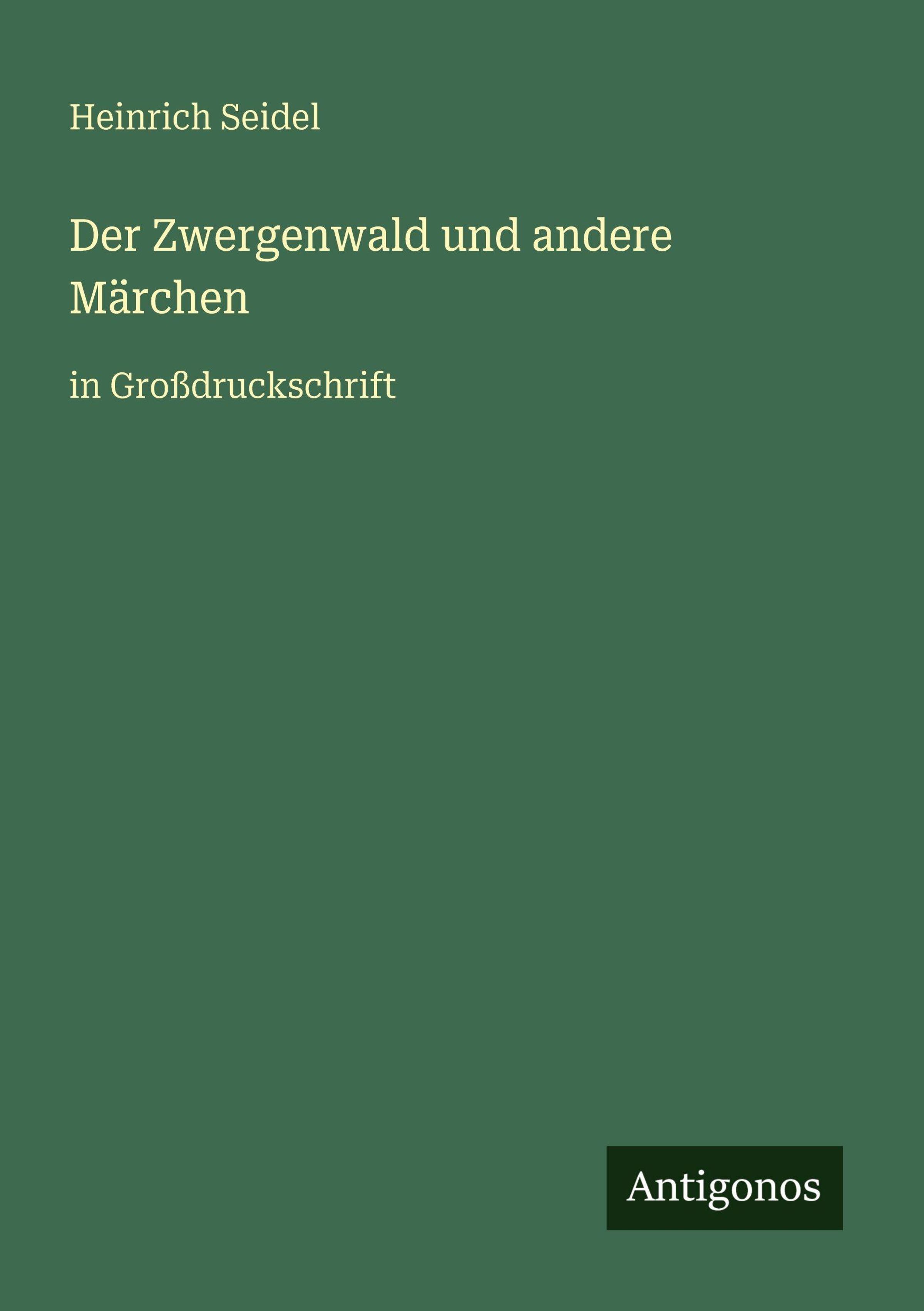"Heinrich Seidel: Der Zwergenwald und andere Märchen. In Großdruckschrift. Unten rechts kleines Logo 'Antigonos'.", Buch