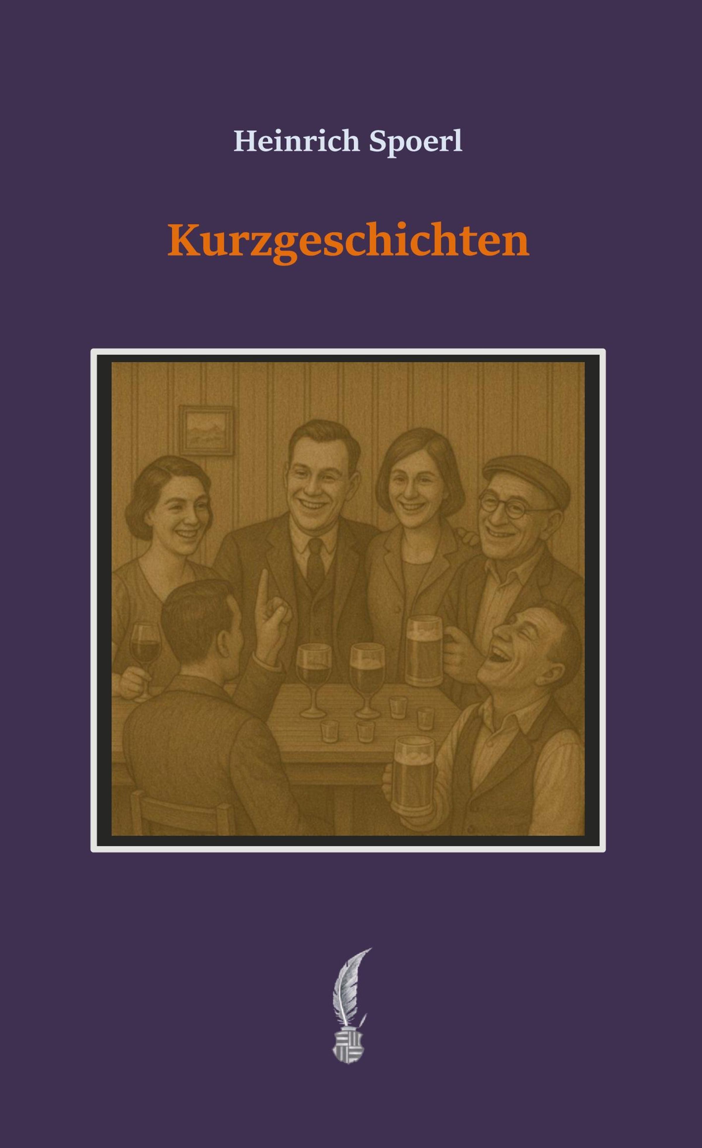 "Heinrich Spoerl: Kurzgeschichten" in weiß und orange. Gemälde von lachenden Menschen an einem Tisch mit Getränken. Unten eine Feder als Logo., Buch