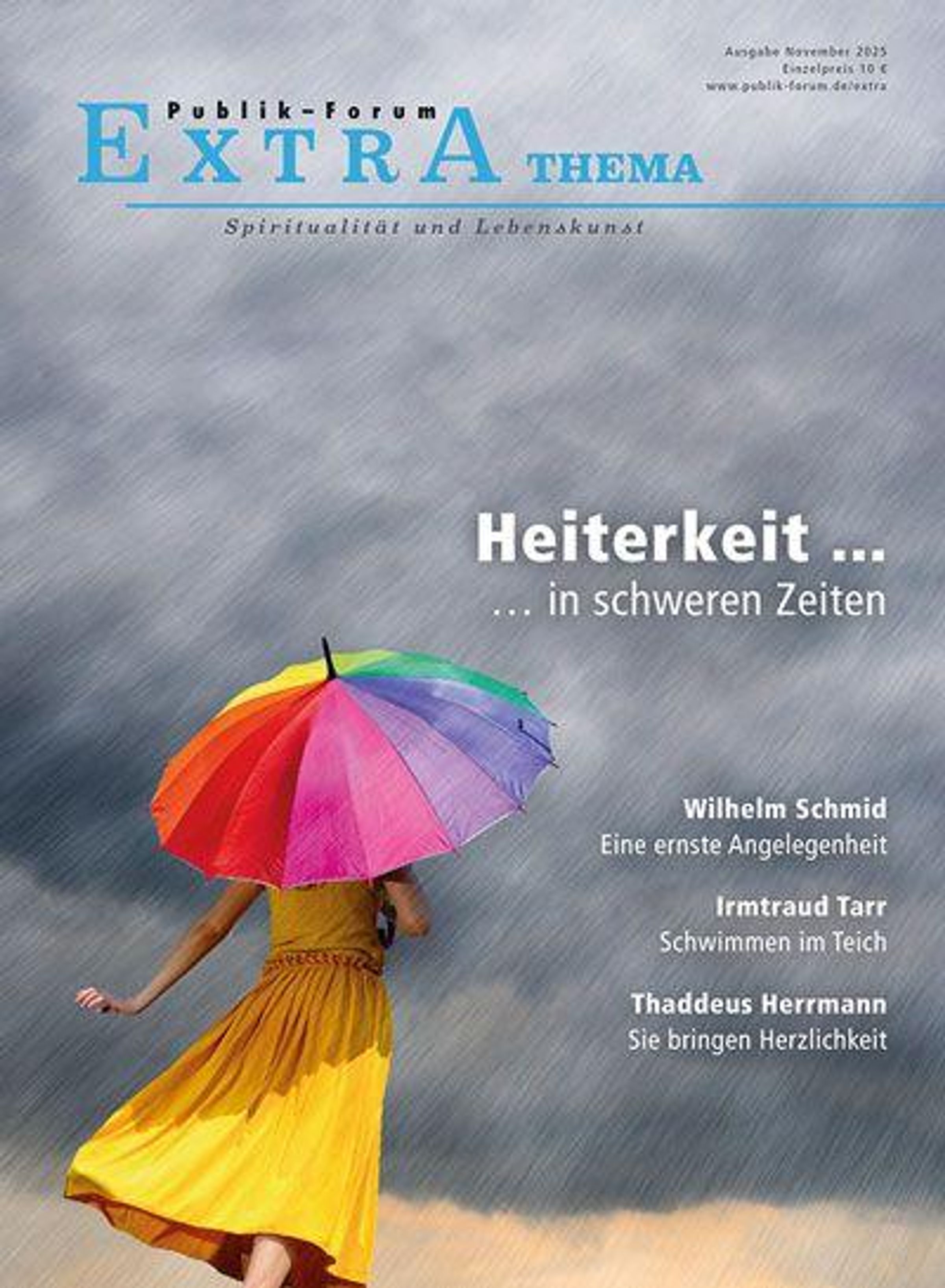 Es ist gewagt, gerade in schweren Zeiten ein EXTRA über 'Heiterkeit' herauszubringen. Nein, wir wollen nicht die unfriedliche Welt da draußen ausblenden und auf die Insel der Seligen fliehen. Das gerade nicht. Denn Heiterkeit meint ja nicht nur schenkelklopfende Witzigkeit, operettenhaftes 'immer nur heiter, immer vergnügt'. Die Heiterkeit, von der die Autorinnen und Autoren in diesem EXTRA erzählen, spielt nicht im 'Land des Lächelns'. Sie ist vertraut mit den Tiefen und Untiefen des Daseins. Sie blickt auf das Ganze des Lebens, wie es sich uns zumutet. Und sagt in einem größeren Einverständnis ein stilles Ja dazu.