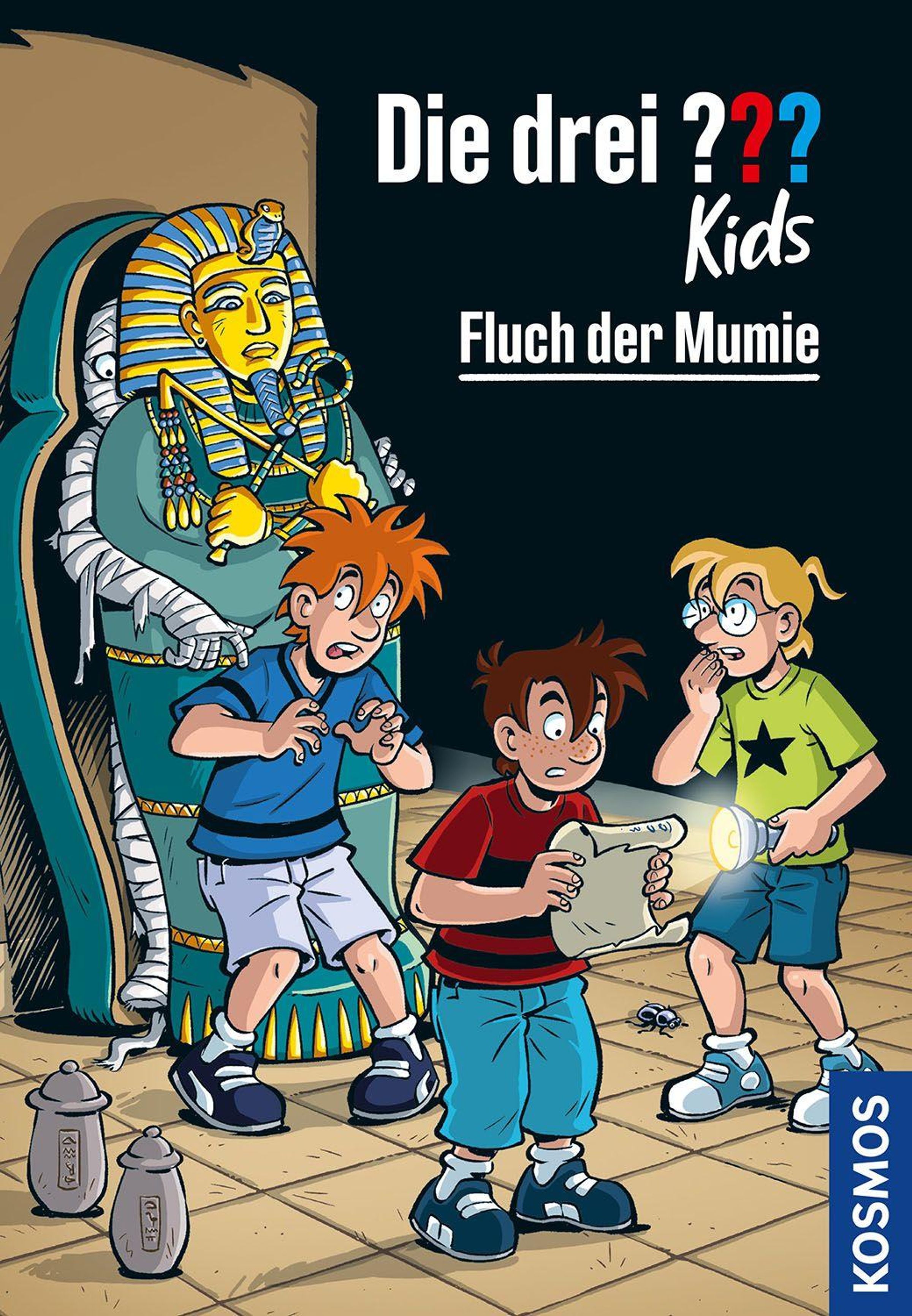 "Die drei ??? Kids: Fluch der Mumie". Drei Jungen in einem Grab, eine Mumie im Hintergrund, Taschenlampe, Schriftrolle., Buch