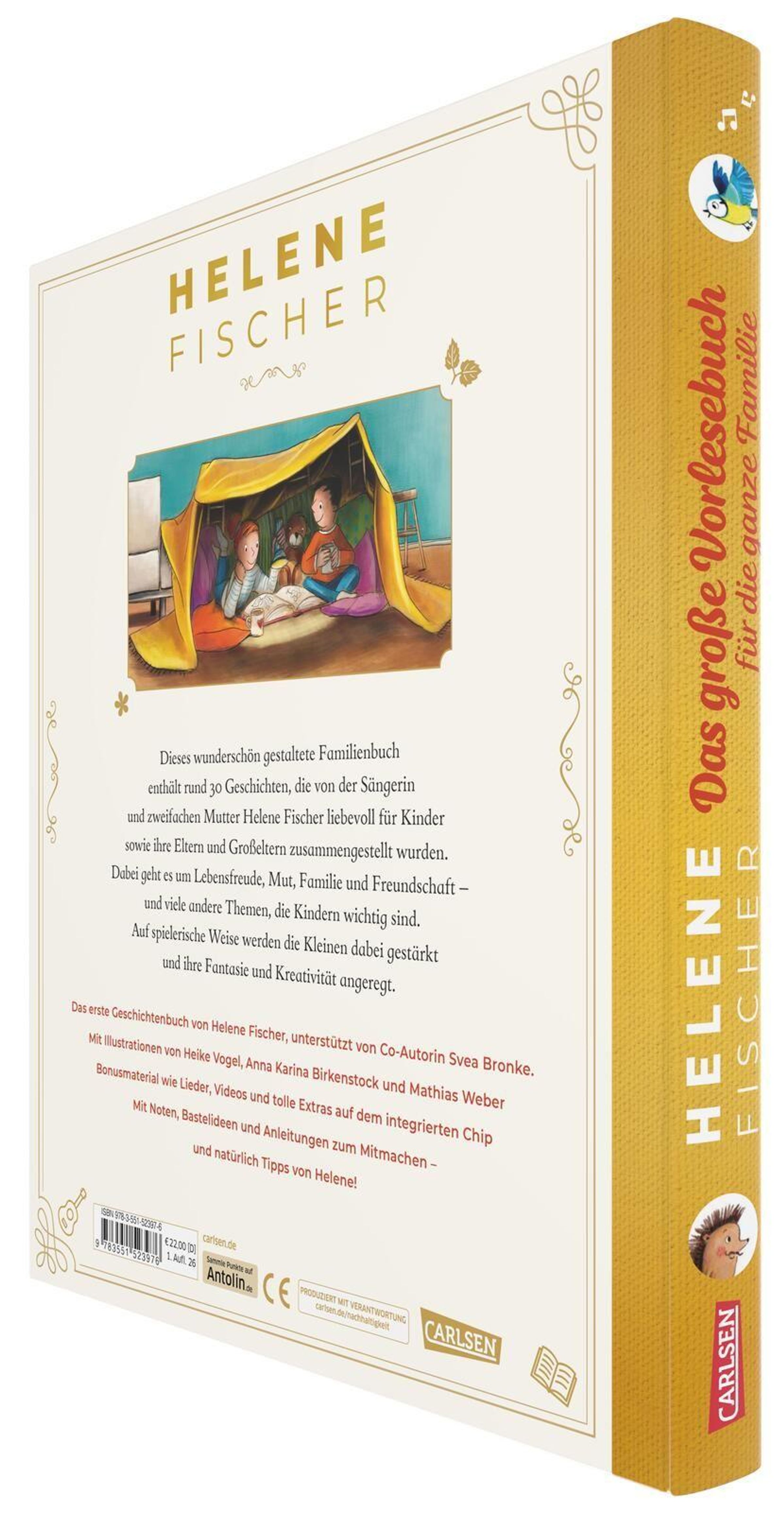 Dieses wunderschön gestaltete Familienbuch enthält rund 30 neue Geschichten , die von der Sängerin und zweifachen Mutter Helene Fischer liebevoll für Kinder und ihre Eltern und Großeltern zusammengestellt wurden. Auf spielerische Weise werden Kinder dabei gestärkt und ihre Fantasie und Kreativität angeregt. Die Länge der Texte ist gut geeignet zum Vorlesen vor dem Schlafengehen. Zusätzlich gibt es Noten zu beliebten Kinderliedern mit Anleitungen und Tipps von Helene sowie ein paar Bastelideen und Rezepte . Mit dem integrierten Chip lässt sich tolles Bonusmaterialauch ganz leicht aufs Handy holen.