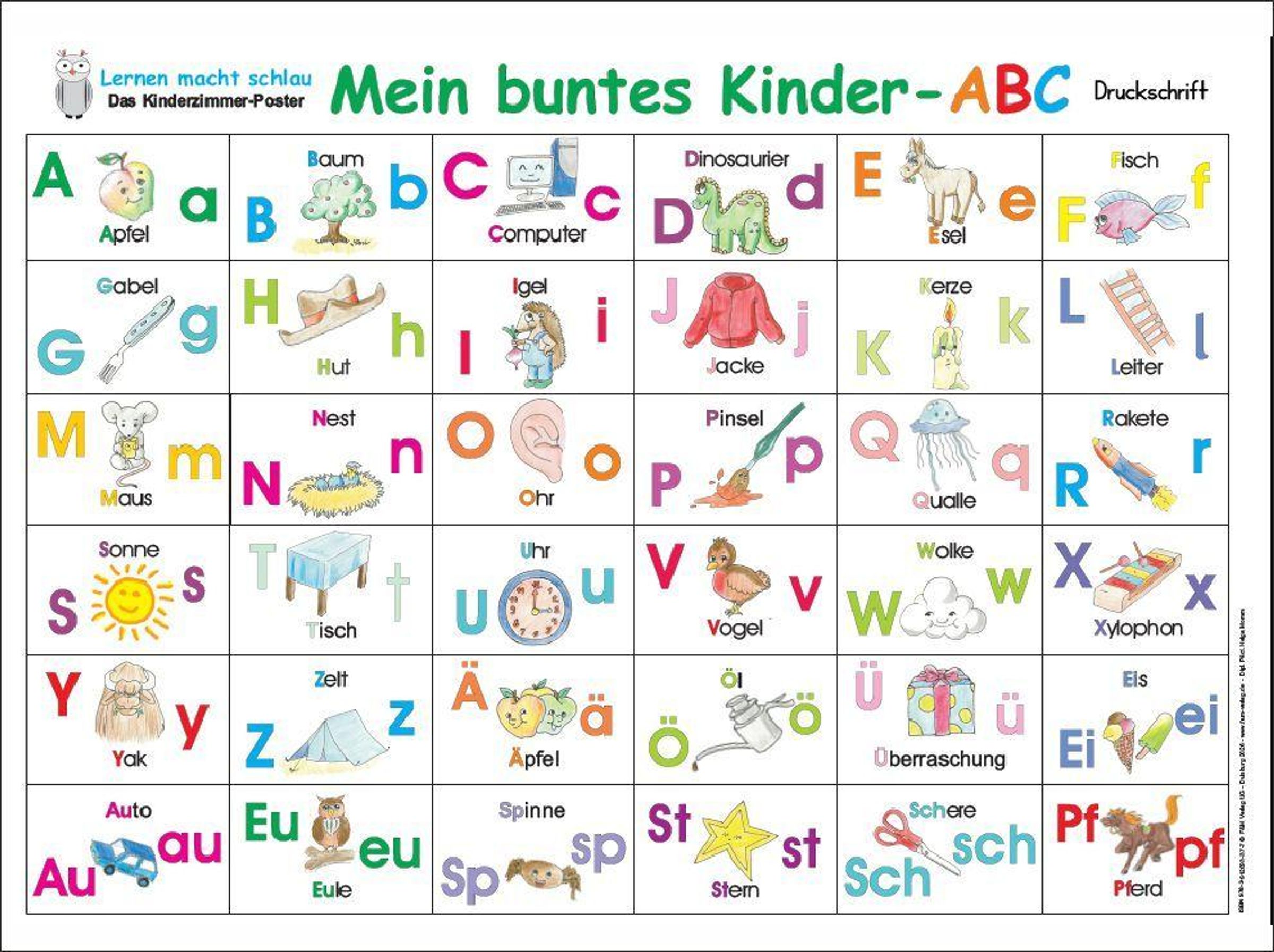 Dieses Poster darf in keinem Kinder- oder Klassen-zimmer fehlen! Kinder lernen das Alphabet und die Umlaute in Groß- und Kleinbuchstaben anhand dieser Anlauttabelle im Posterformat kennen. Die kindgerechten Illustrationen unterstützen auf spielerische Weise den Lernprozess