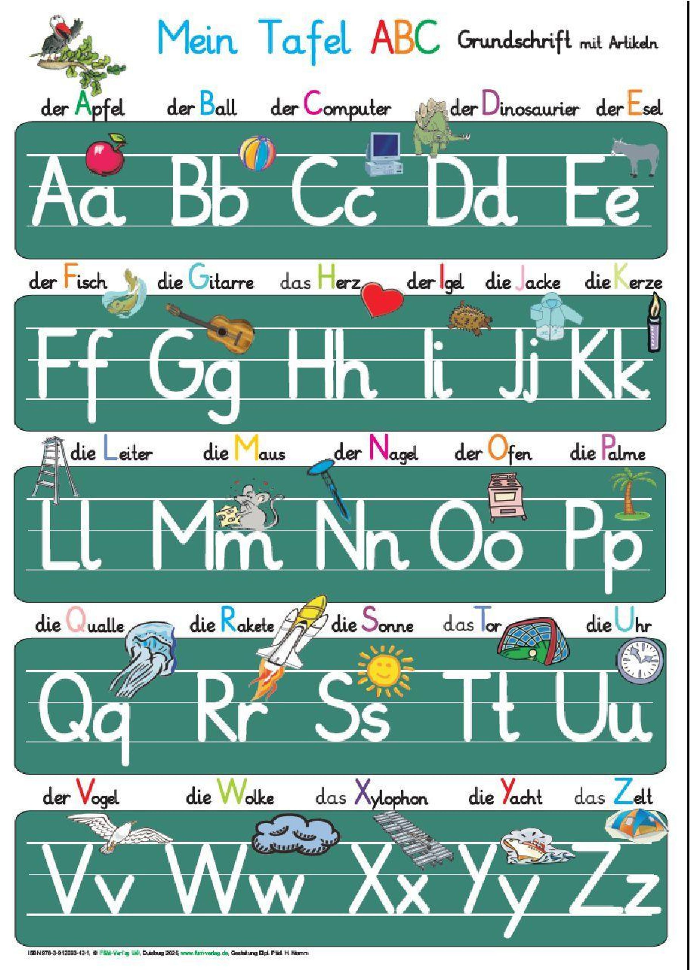 Mein Tafel ABC in Grundschrift mit Artikeln Poster DINA4 laminiert Das Poster ist besonders für Maxi-Kindergartenkinder und zur Einschulung geeignet. Dieses ABC-Poster macht allen Kindern Freude das Alphabet in Groß- und Kleinbuchstaben zu entdecken. Bei jedem Großbuchstaben ist ein Gegenstand abgebildet. So können die Kinder das ABC mit dem Gegenstand in Verbindung bringen und lernen dadurch spielerisch das Alphabet kennen. Dieses Poster ist ideal geeignet für jedes Kinderzimmer, für den Kindergarten und für jedes Klassenzimmer. Die wunderschönen kindgerechten Illustrationen laden die Kinder ein, spielerisch das ABC zu entdecken. Ein ideales Geschenk zur Einschulung für die Schultüte!