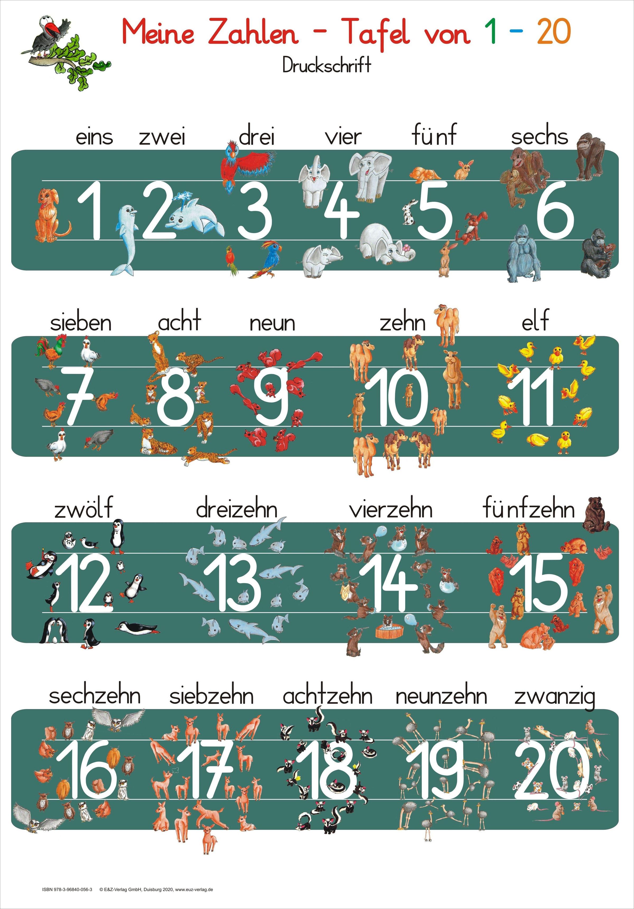 Meine Zahlentafel von 1 - 20 Ein abwaschbares, großes Poster DINA3 laminiert Das Poster ist besonders für Maxi-Kindergartenkinder und zur Einschulung geeignet. Dieses Zahlen-Poster macht allen Kindern Freude die Zahlen von 1-20 zu entdecken. Bei jeder Zahl ist die entsprechende Anzahl der Tiere abgebildet, so können die Kinder die Zahlen mit der Anzahl der Tiere in Verbindung bringen und lernen dadurch spielerisch die Zahlen von 1-20 kennen.