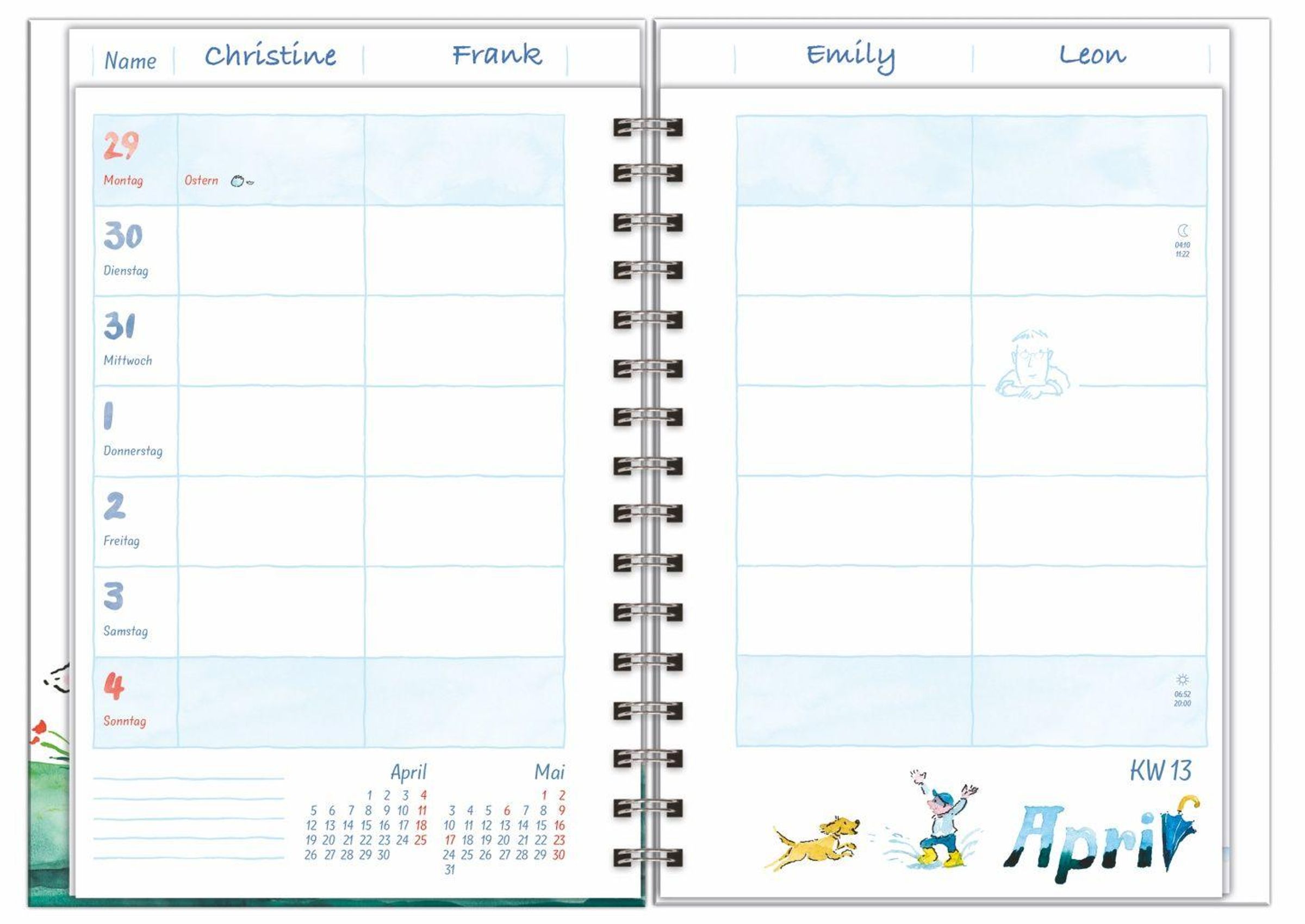 - Familienkalender mit 4 Spalten. Liebevoll illustrierter Buch-Kalender mit Einstecktasche und Schulferien. Terminplaner mit 160 Seiten.