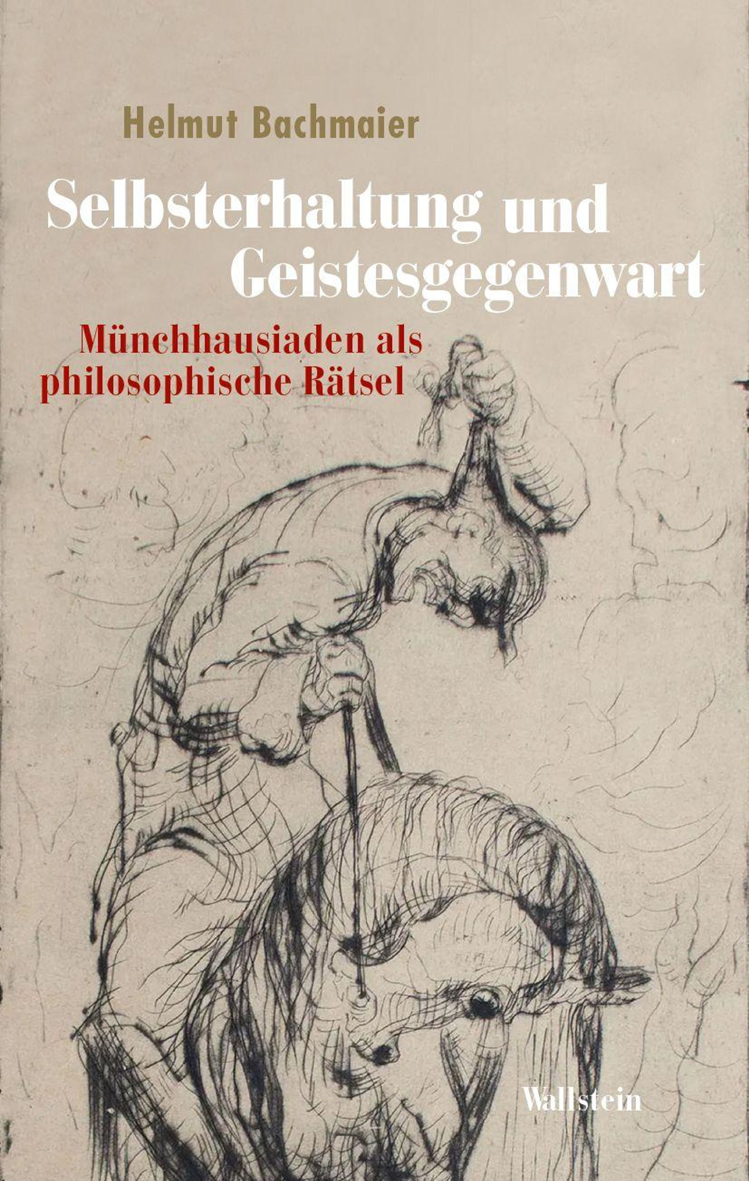 "Selbsterhaltung und Geistesgegenwart" steht in Weiß, darunter in Rot "Münchhausiaden als philosophische Rätsel" vor einer Zeichnung., Buch