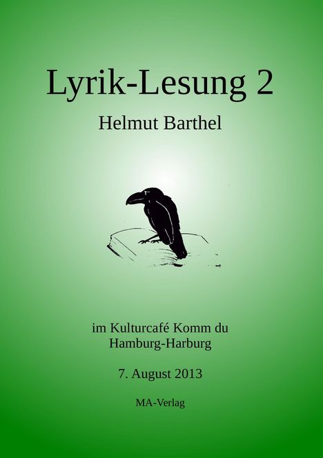 Seit Mai 2013 präsentierte Helmut Barthel in lockerer Lesefolge aus seinem reichen Fundus von über 1000 Gedichten im Kulturcafé Komm du in Hamburg-Harburg eine Auswahl aus der Edition "Dichterstube". Die ersten fünf Lesungen zeichnet der MA-Verlag jetzt mit einer Reihe von fünf Lyrikbändchen nach, die so unterschiedliche Bereiche wie 'Innen- und Umwelt', 'Politik und Soziales', 'Mythisches und Magisches', Sprache und Denken' und nicht zuletzt 'Humoristisches und Satire' umfassen. Jene, die dabei waren, mögen sich so den Eindruck noch einmal wachrufen, den der überzeugende Vortrag hinterließ, aber auch in der reinen Lektüre entfaltet sich Helmut Barthels Wortmagie auf einzigartige Weise.