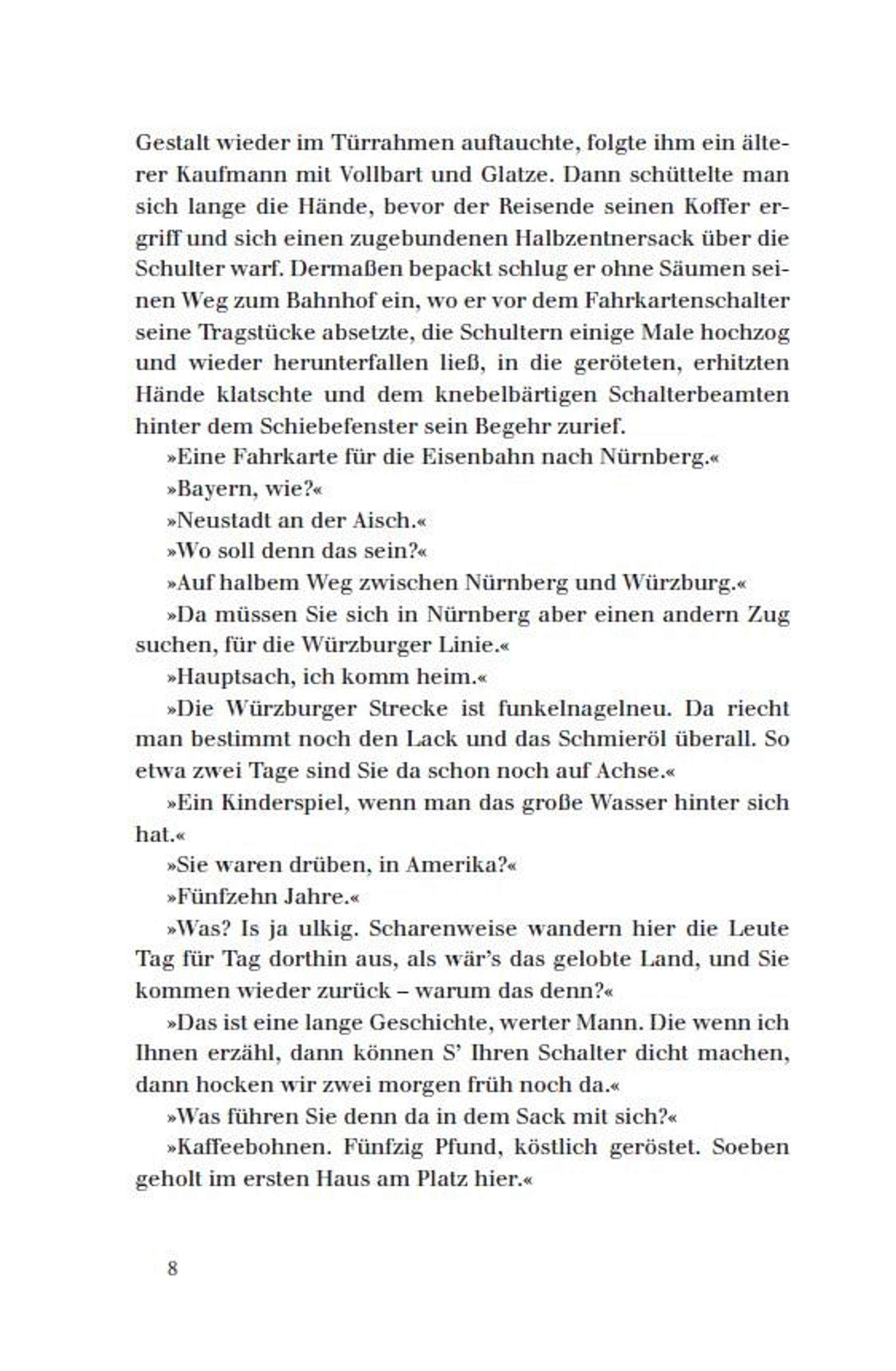 Auf der Suche nach einem besseren Leben wandert Bauernsohn Michael Wegmann nach Amerika aus. 1867 kehrt er als gereifter Mann in seinen fränkischen Geburtsort zurück. Mit im Gepäck: ein Sack Kaffeebohnen, ein Klumpen Gold - und der Traum, in der Provinz ein außergewöhnliches Kaffeehaus zu eröffnen. Von den Einheimischen zuerst teils beneidet, teils belächelt, entwickelt sich Wegmanns Lokal bald zu einem Anziehungspunkt. Die unterschiedlichsten Menschen können hier ihre Erfahrungen miteinander teilen und sich ihren kargen Alltag mit Köstlichkeiten versüßen. Gesellschaftliche Umbrüche wie persönliche Tragödien werfen jedoch immer wieder ihre Schatten auf den Ort, an dem Geschichte und Geschichten sich treffen. Kann das Kaffeehaus die Wirren der Zeit überstehen und Wegmann sich seinen Lebenstraum bewahren? Der historische Roman für Franken - opulent, poetisch, episodenreich und dramatisch.
