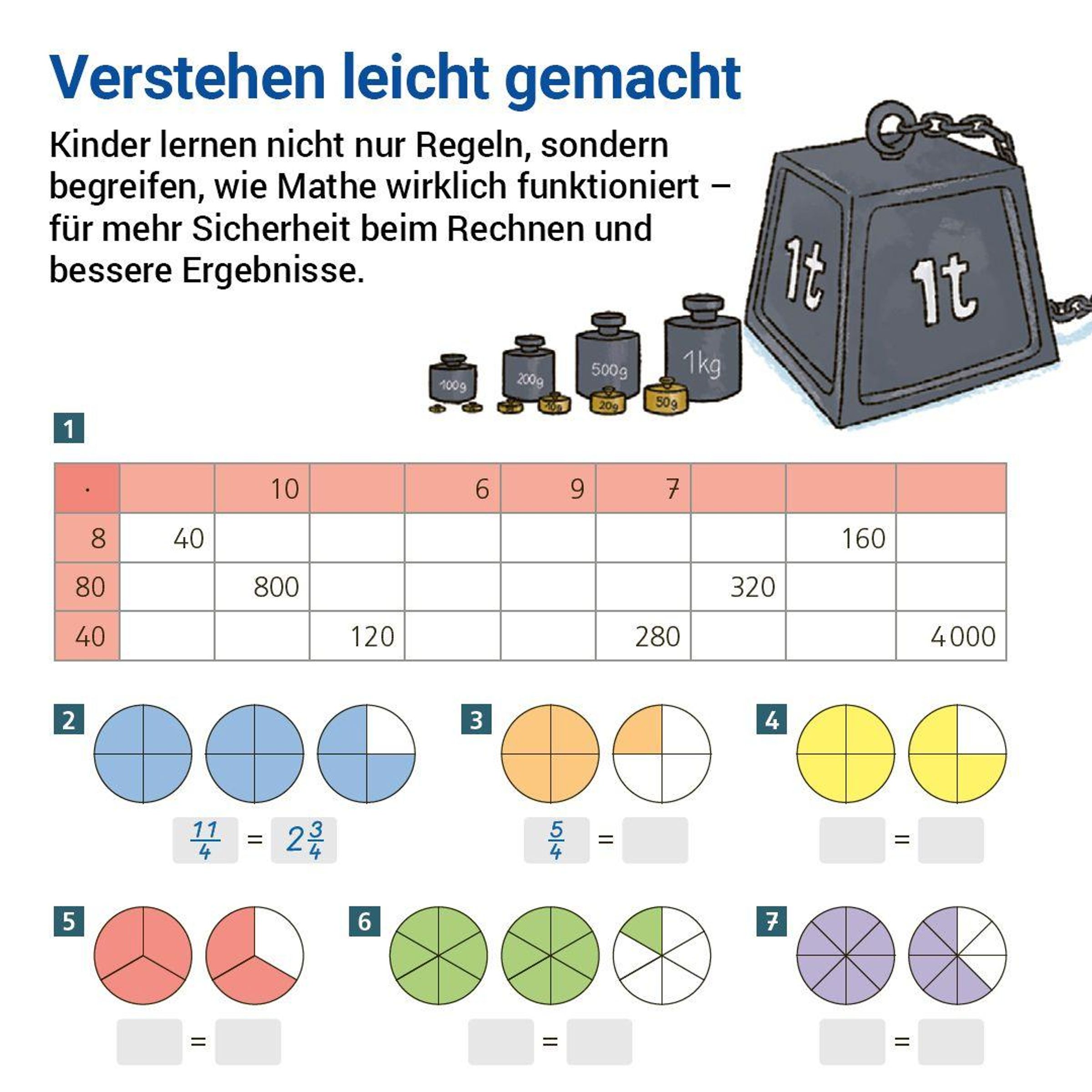 - Kleinschrittiger, systematischer Aufbau des Bruchrechnens