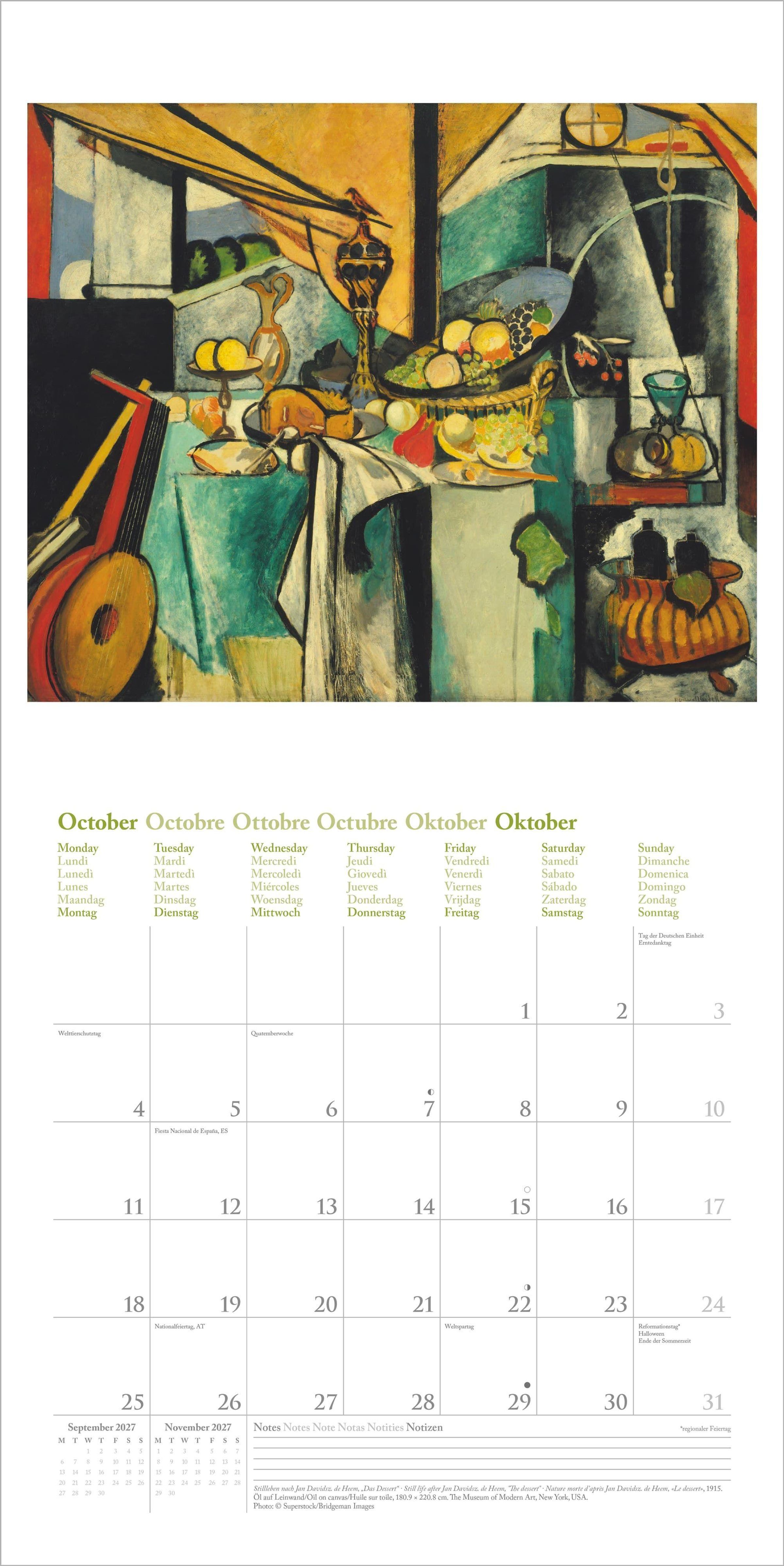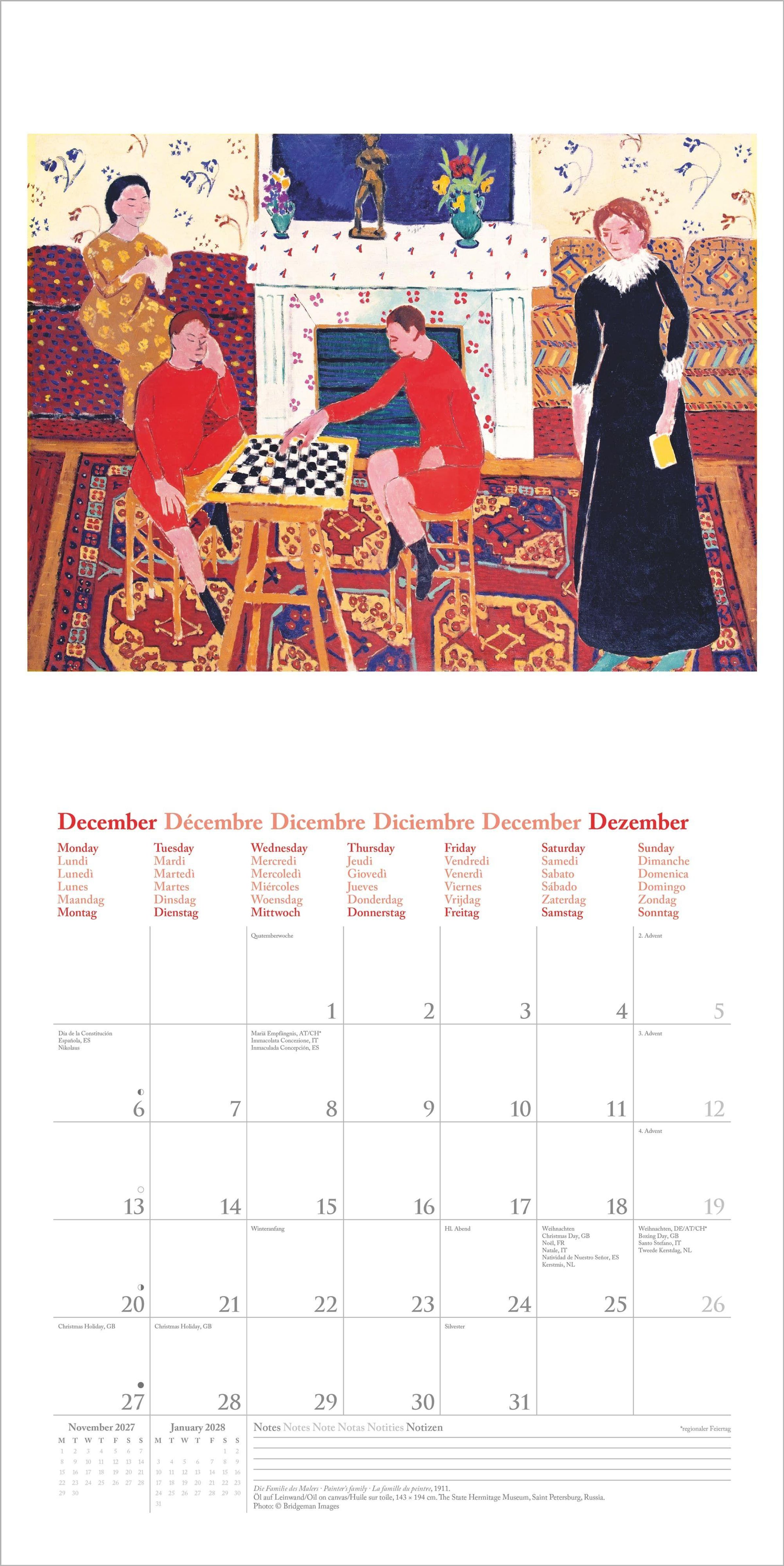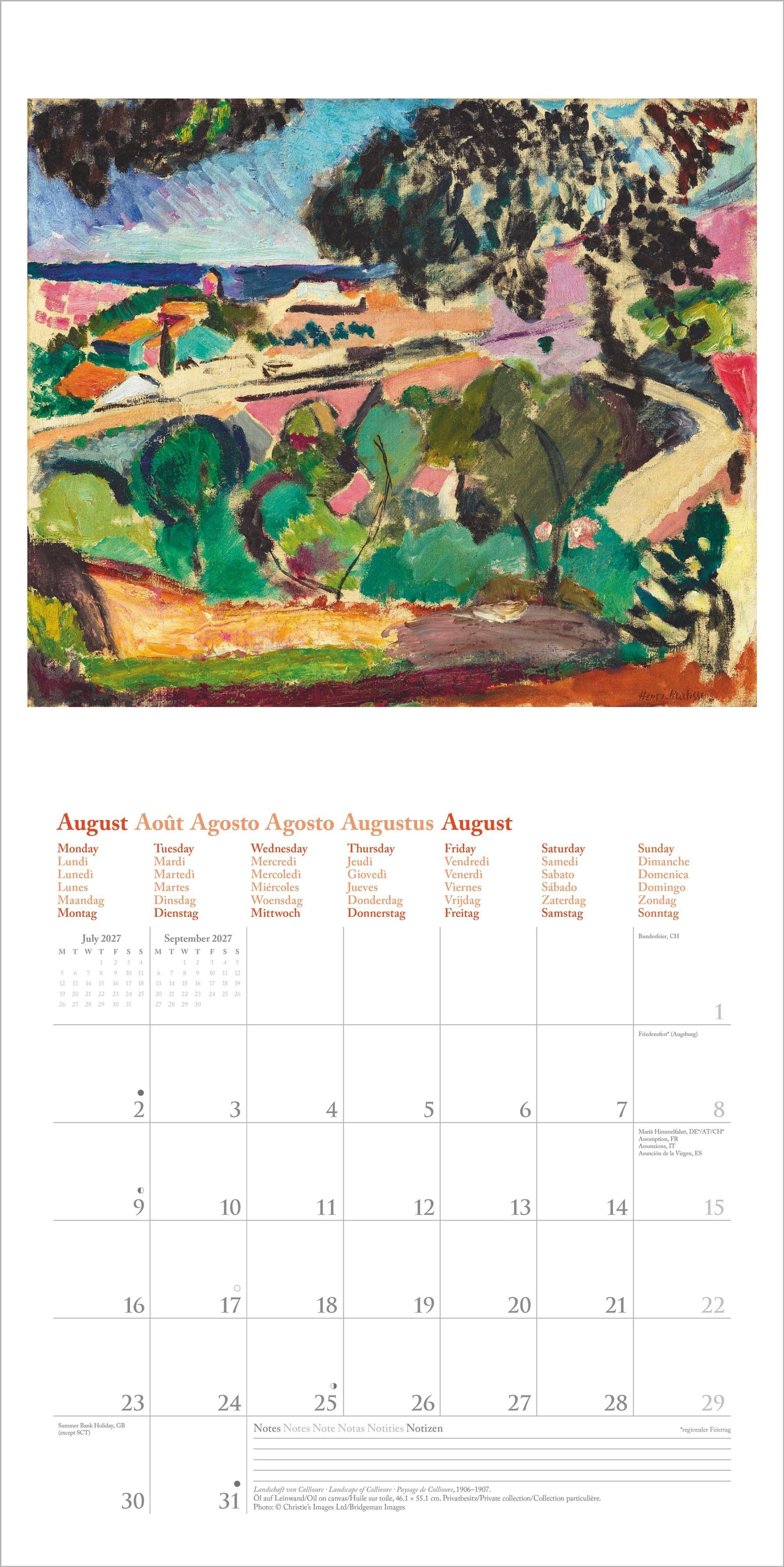 Dieser hochwertige Kunstkalender verbindet Matisse' künstlerische Brillanz mit praktischer Funktionalität -- ein stilvoller Begleiter für das Jahr 2027 und ein Highlight für jede Wand.