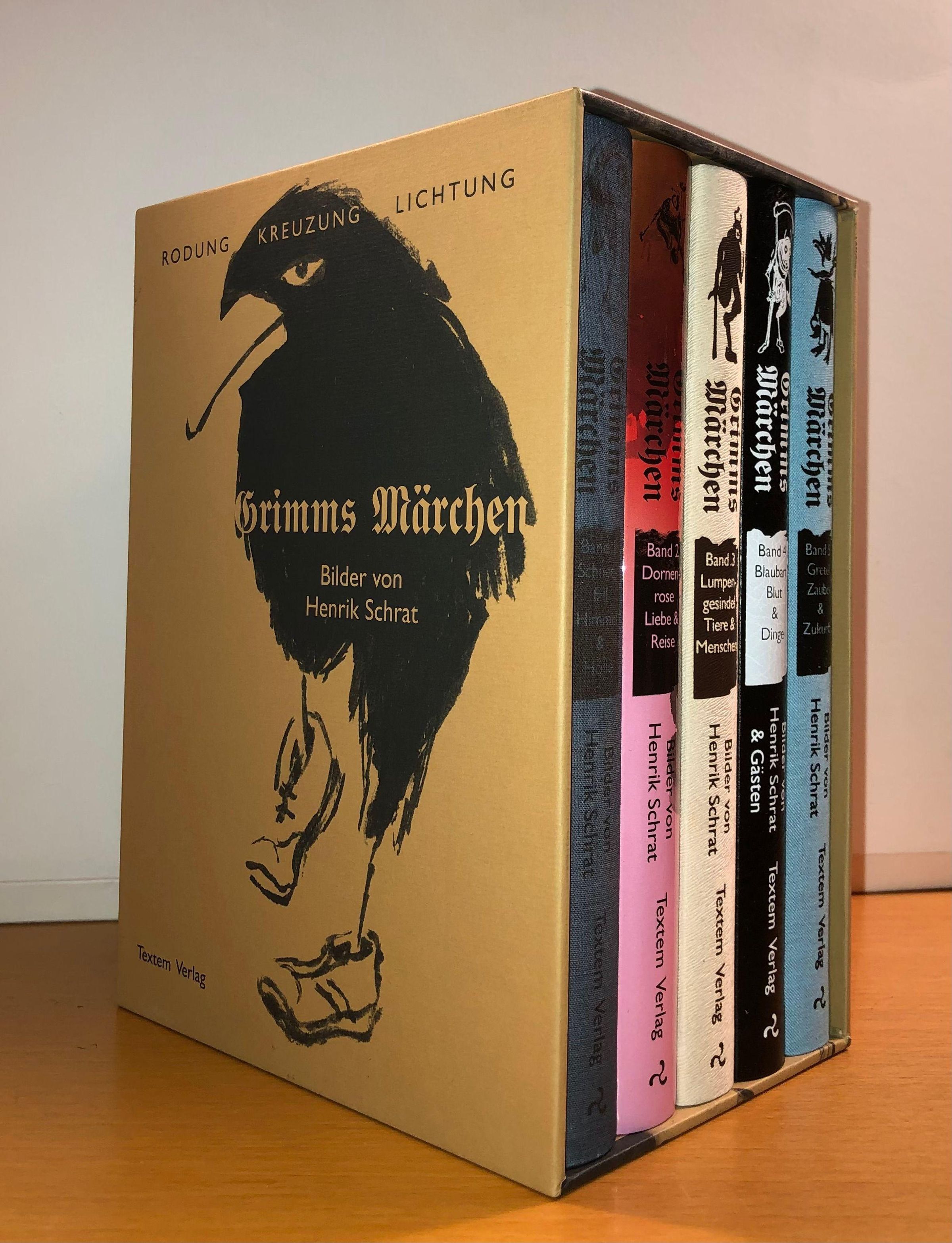 Schuber mit der Aufschrift: "RODUNG KREUZUNG LICHTUNG. Grimms Märchen. Bilder von Henrik Schrat. Texem Verlag." Gezeichnete Krähe., Buch