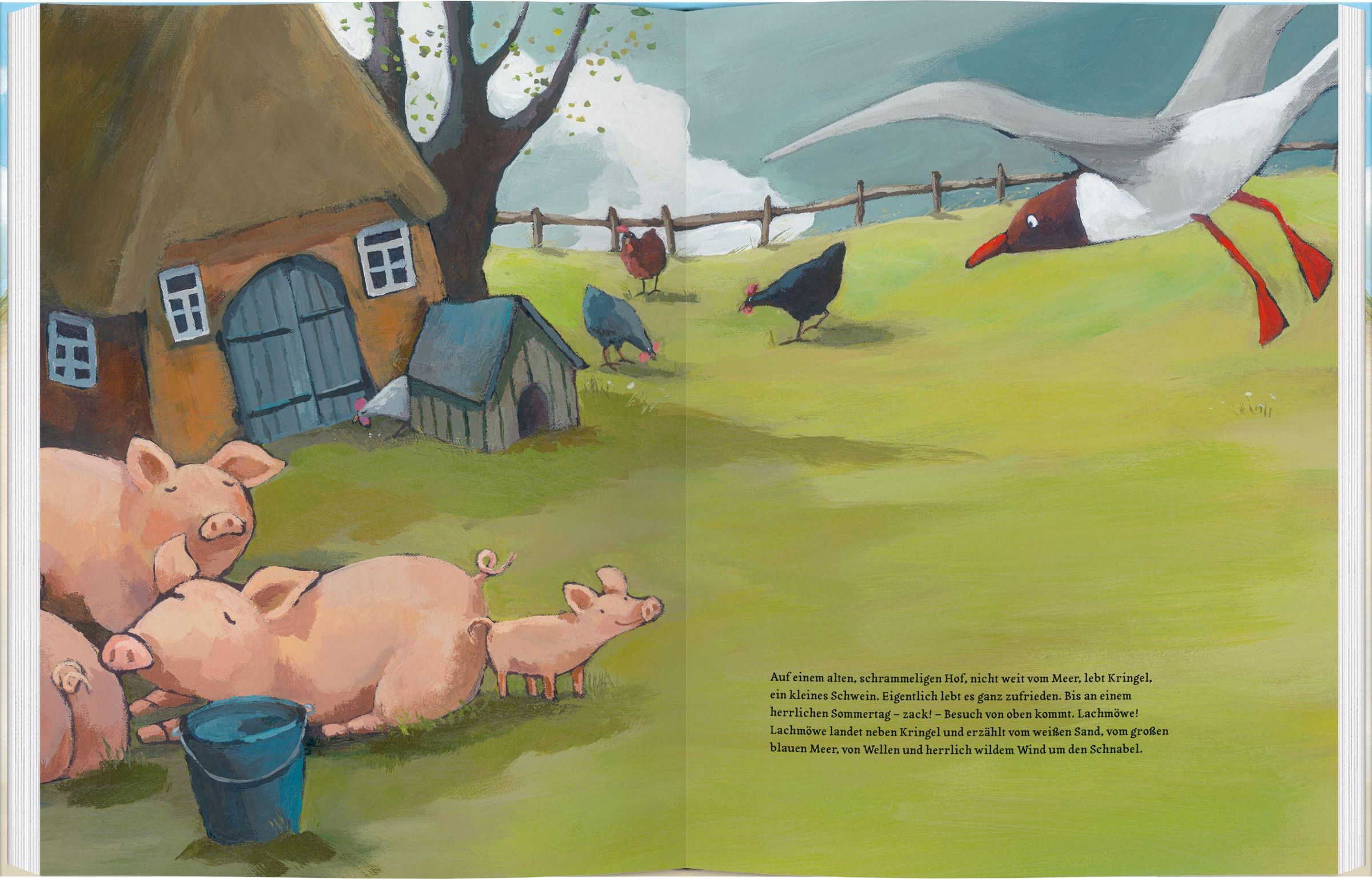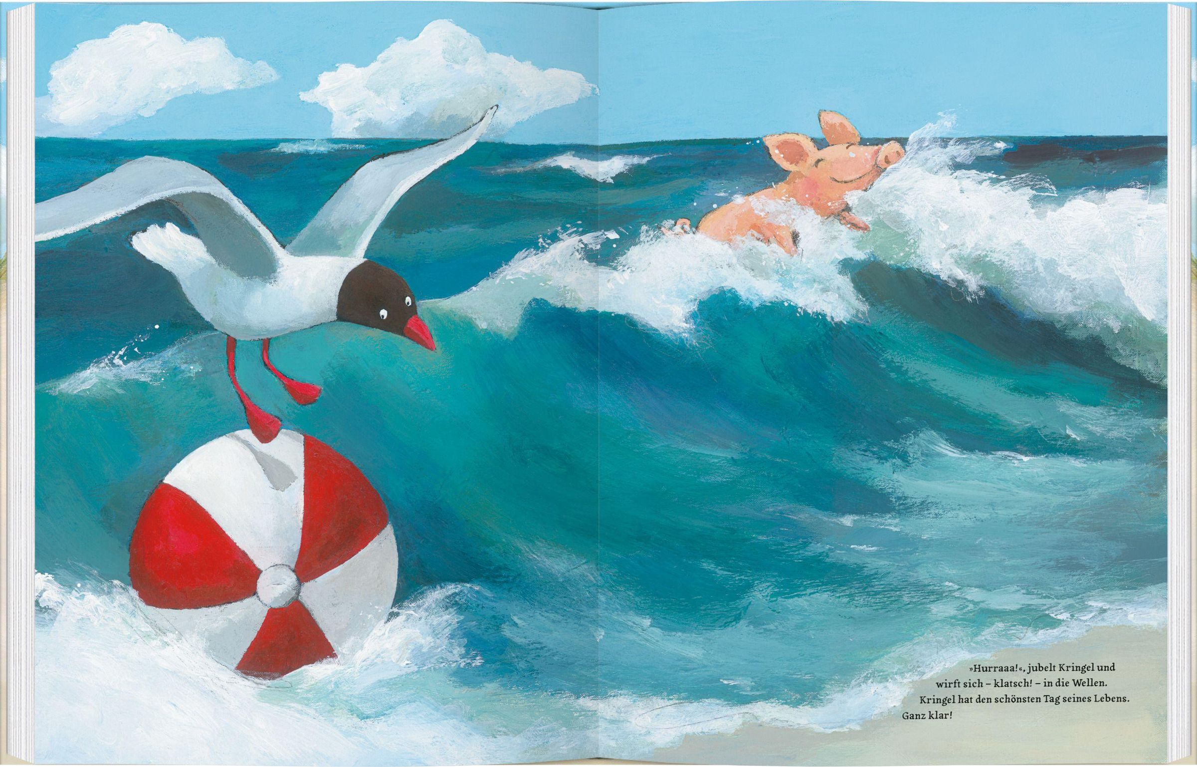 Auf einem alten Hof lebt Kringel. Das kleine Schwein hat einen großen Traum seit Lachmöwe ihm vom weiten blauen Meer und dem Strand erzählt hat. Einmal ans Meer! Die anderen Hoftiere halten nichts von solchen Flausen. Aber Kringel nutzt seine Chance und trippelt zuversichtlich los. Manchmal fühlt es sich zu klein für ein so großes Abenteuer, aber als es endlich den warmen Sand unter den Hufen spürt und die Wellen vor ihm in der Sonne glitzern, ist es das glücklichste Schweinchen, das man sich denken kann. Henrike Wilson gelingt es in ihren großflächigen Acryloriginalen, das Licht der Küste leuchten zu lassen. Eine Glücks- und Freundschaftsgeschichte über den Mut, seiner Sehnsucht zu folgen.