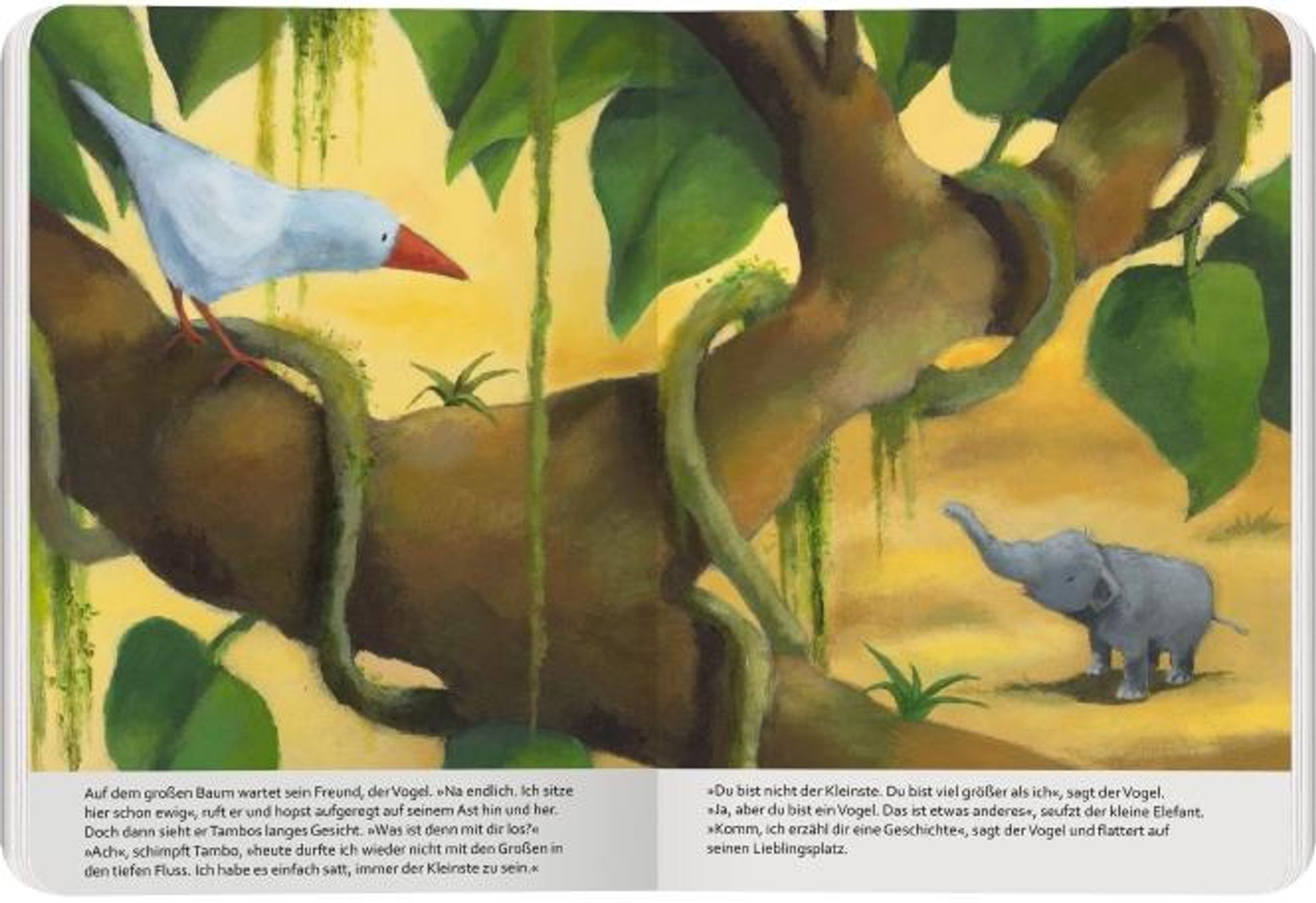 Tambo hat es satt, immer der Kleinste zu sein. Schließlich ist er ein Elefant! Er will den anderen beweisen, dass er schon groß ist, aber sein Plan funktioniert nicht. Als er enttäuscht zu seiner Herde zurücktrottet, stehen da alle großen Elefanten und in der Mitte seine Mama. Groß und grau und lieb wie immer. Neben ihr steht Tambos frisch geborene kleine Schwester. Da spürt Tambo bis in die Rüsselspitze, wie gut es sich anfühlt, als großer Bruder erwartet und gebraucht zu werden. Und dass nun seine Schwester die kleinste der Herde ist, findet er ganz großartig.