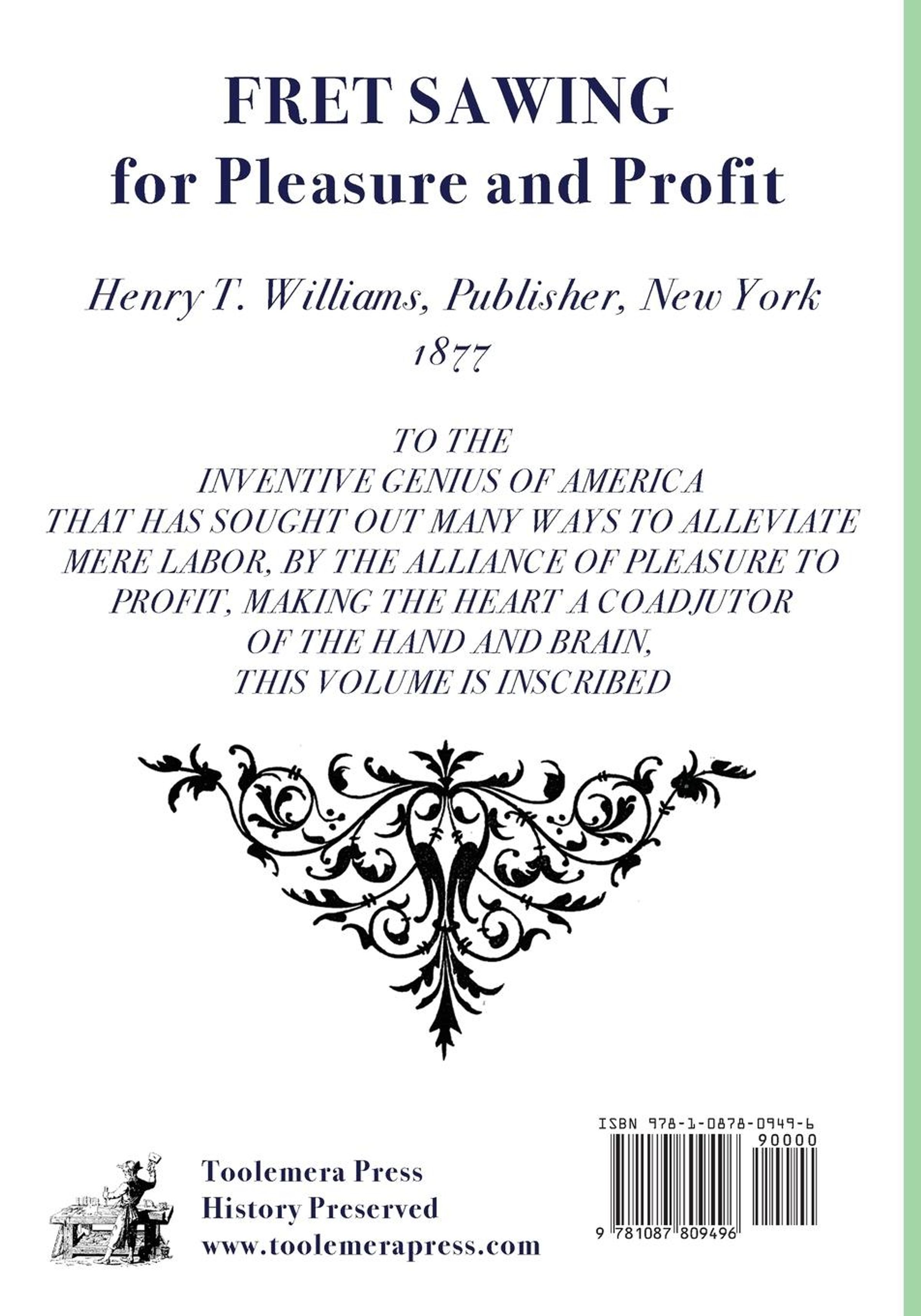Fret Sawing For Pleasure And Profit, first published in 1877 by Henry T. Williams, New York, NY. Introductory essay by Gary Roberts on the historical context of Fret Sawing For Pleasure And Profit and fret-work in 19th century America. Illustrated by 103 images of fret work patterns and tools. "Fret Sawing For Pleasure And Profit, is like those which have preceded it, a most excellent manual of the particular art which it pictures and describes. Beginning with a chapter devoted to materials and implements, it tells all about the proper kinds of wood to be used in Fret Sawing, their qualities and peculiarities. It gives illustrations and diagrams of tools and presses, furnishes a quantity of beautiful designs, and teaches how to gild, dye and stain wood to produce picturesque effects. There is also a chapter upon hand-carving, and easy directions for inlaying and over-laying, in addition to many useful suggestions in regard to the adaptability of material and design to work. To amateurs and lovers of this beautiful work, it will prove an invaluable auxiliary, and we strongly recommend it to their consideration." Demorest's Family Magazine, Volume 14, 1878. Gary Roberts, publisher of The Toolemera Press imprint, returns classic books on early crafts, trades and industries to print publication. All titles are selected from his personal collection and produced in-house, to the highest quality, in facsimile.