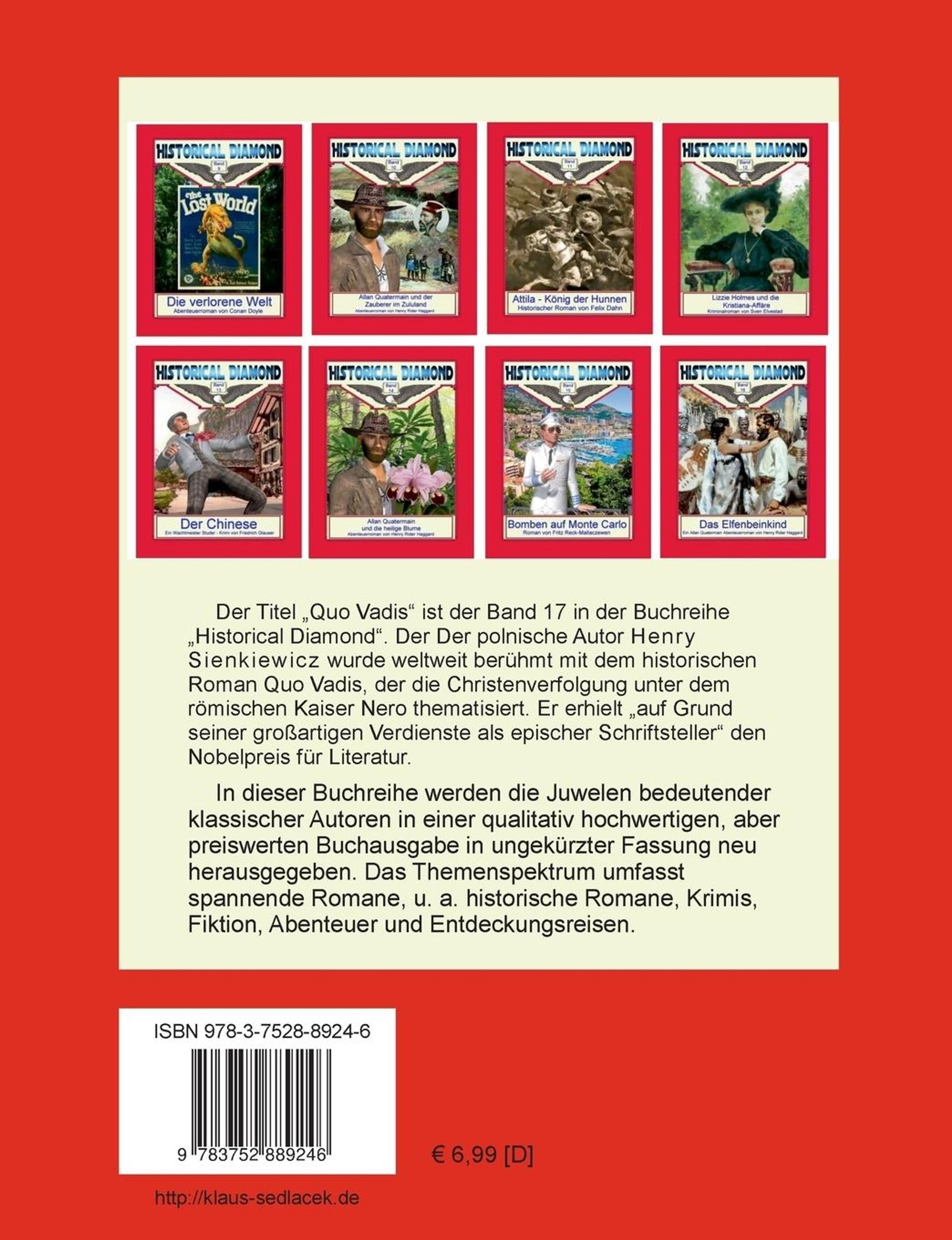 Der Titel 'Quo Vadis' ist der Band 17 in der Buchreihe 'Historical Diamond'. Der polnische Autor Henry Sienkiewicz wurde weltweit berühmt mit dem historischen Roman Quo Vadis, der die Christenverfolgung unter dem römischen Kaiser Nero thematisiert. Er erhielt 'auf Grund seiner großartigen Verdienste als epischer Schriftsteller' den Nobelpreis für Literatur. In dieser Buchreihe werden die Juwelen bedeutender klassischer Autoren in einer qualitativ hochwertigen, aber preiswerten Buchausgabe in ungekürzter Fassung neu herausgegeben. Das Themenspektrum umfasst spannende Romane, u. a. historische Romane, Krimis, Fiktion, Abenteuer und Entdeckungsreisen.