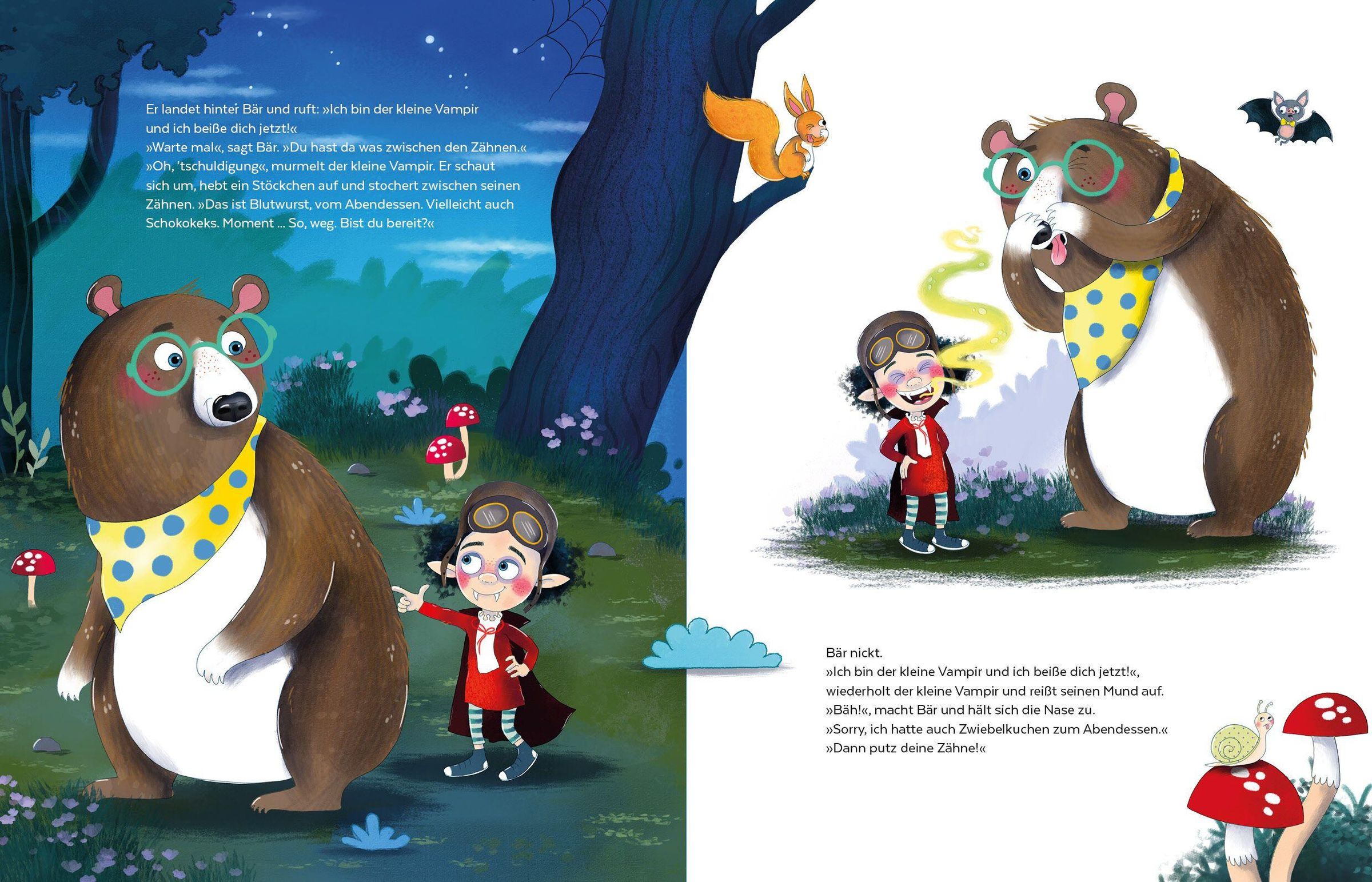 Eines Nachts landet der kleine Vampir vor Bär, doch mit dem Beißen wird es heute nichts! Denn Bär verlangt, dass der Vampir erst mal seine Zähne putzen soll. Doch wie geht das nur? Zusammen machen sich die beiden auf, um im Wald oder drumherum herauszufinden, wie der kleine Vampir seine Beißerchen am besten putzen könnte. Und zwar nicht nur ein BISSchen sauber, sondern blitzeblank ...