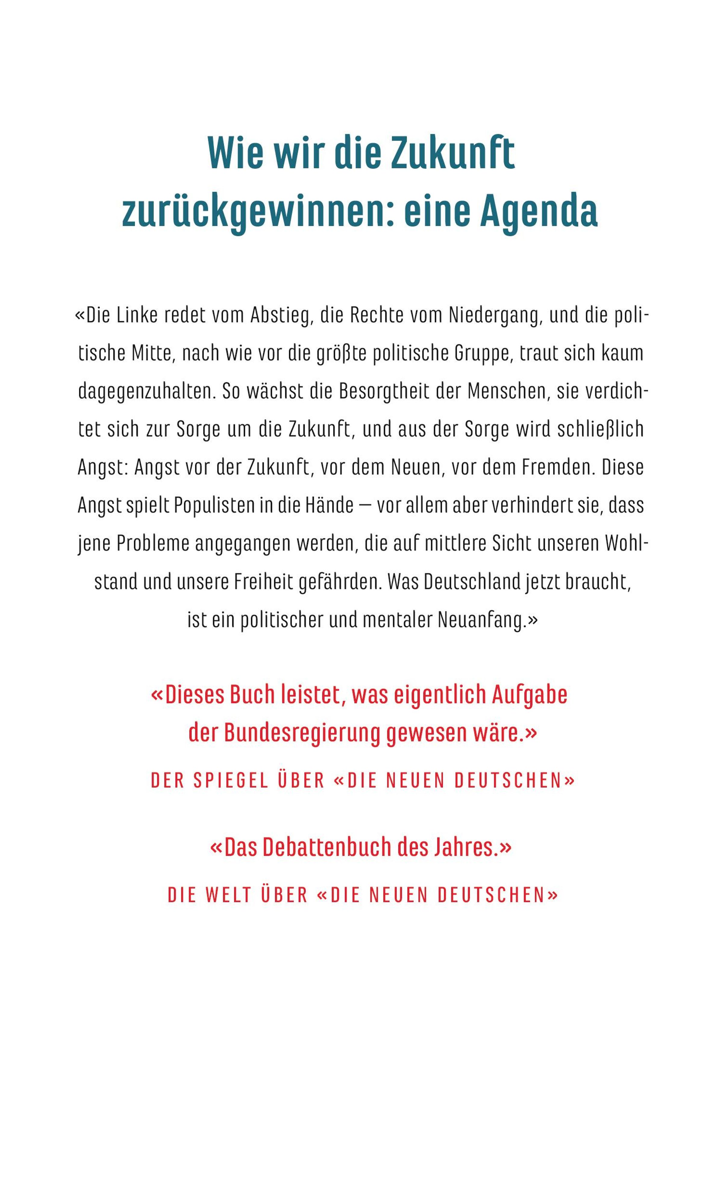 <<Dieses Buch leistet, was eigentlich Aufgabe der Bundesregierung gewesen wäre>>, schrieb der <<Spiegel>> über das Vorgängerbuch <<Die neuen Deutschen>> - und das gilt genauso für dieses: Es bekämpft falsche, gefährliche Ängste und zeigt, was Deutschland jetzt braucht und wie wir die Zukunft zurückgewinnen können.