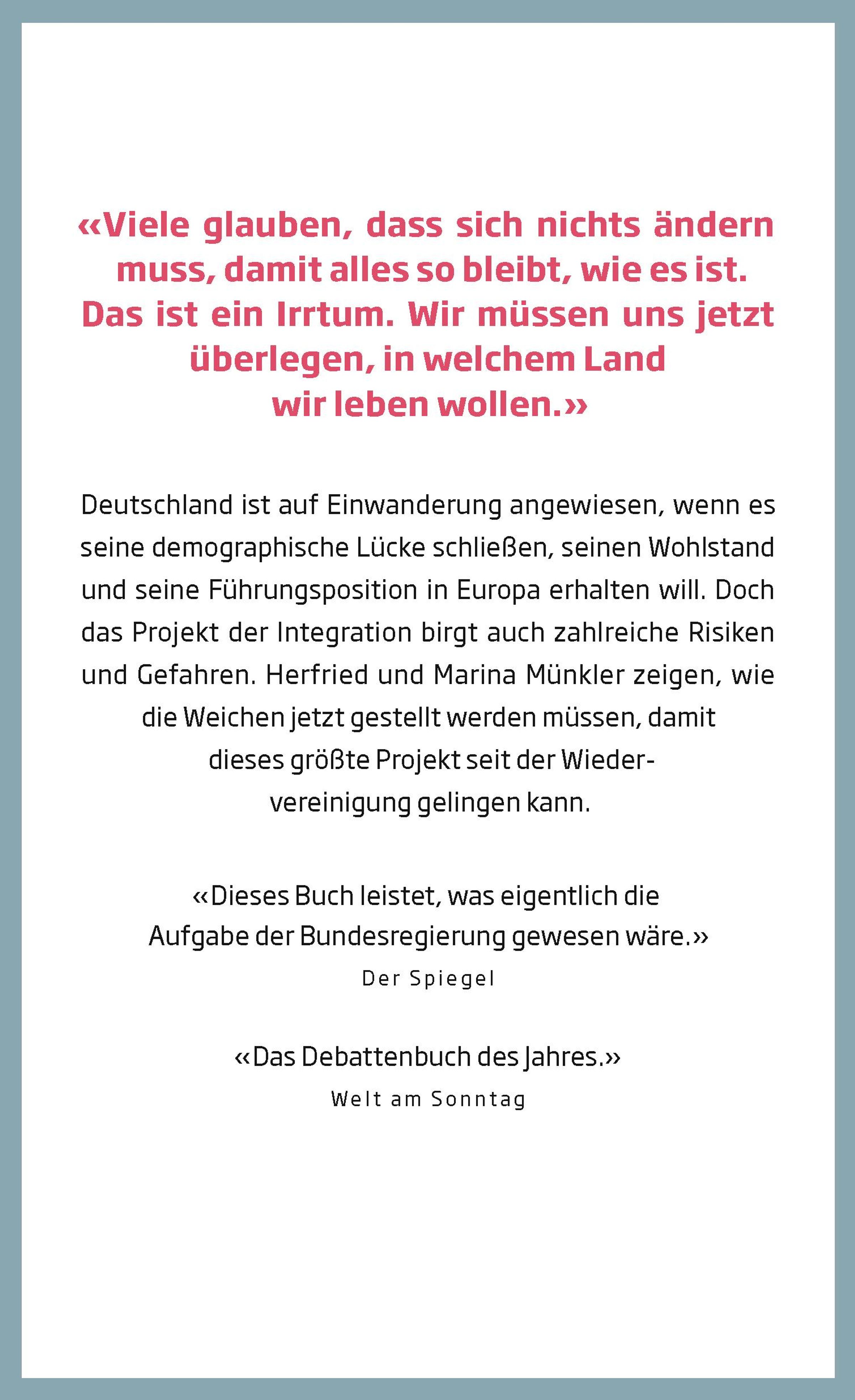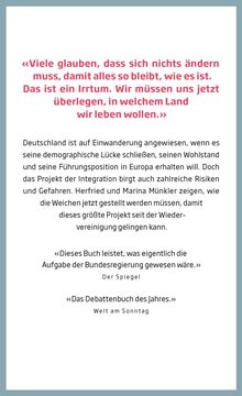 Herfried und Marina Münkler betten die aktuelle Situation ¿ jenseits der Aufgeregtheiten der Tagespolitik ¿ in den historischen Zusammenhang ein und weisen darauf hin, dass Wanderungs- und Fluchtbewegungen nicht die Ausnahme, sondern die Regel sind. Deutschland hat sich immer wieder ¿ mit neuen Menschen ¿ neu aufgestellt. Das wird auch heute nicht ohne Brüche und Probleme abgehen: Mächtige, oft divergierende Kräfte werden in der deutschen Gesellschaft freigesetzt. Wie können sie beherrscht werden, was muss man tun, damit wir ihnen nicht wehrlos gegenüberstehen? Herfried und Marina Münkler benennen die Risiken und Gefahren präzise und realistisch; gleichzeitig zeigen sie aber auch die großen Chancen auf, die sich uns bieten.