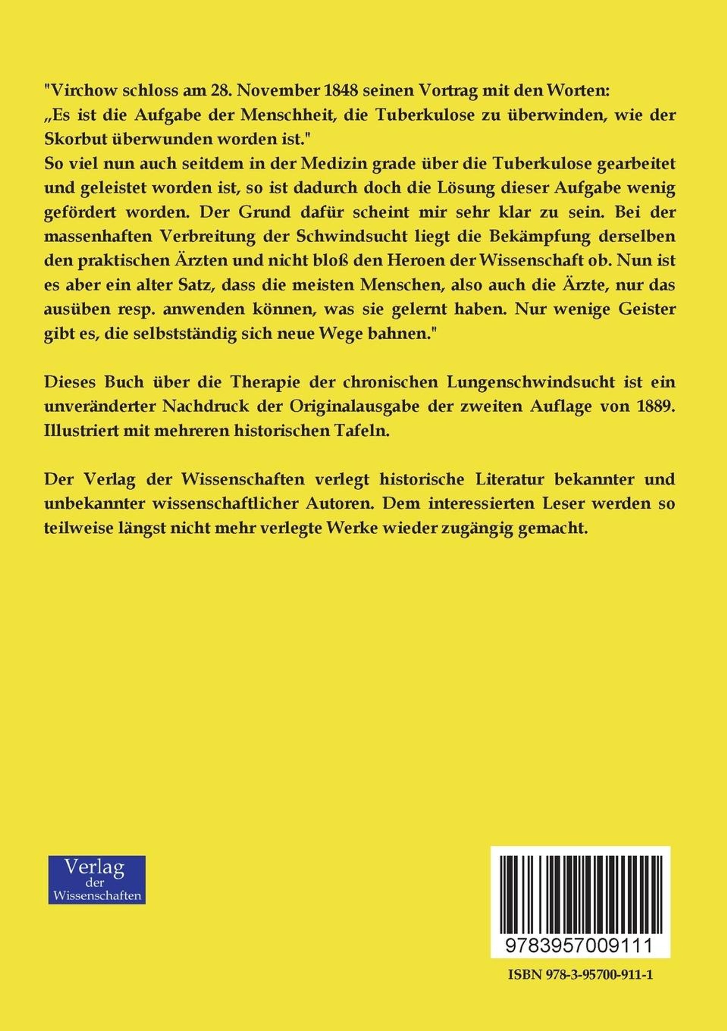 Dieses Buch über die Therapie der chronischen Lungenschwindsucht ist ein unveränderter Nachdruck der Originalausgabe der zweiten Auflage von 1889. Illustriert mit mehreren historischen Tafeln.