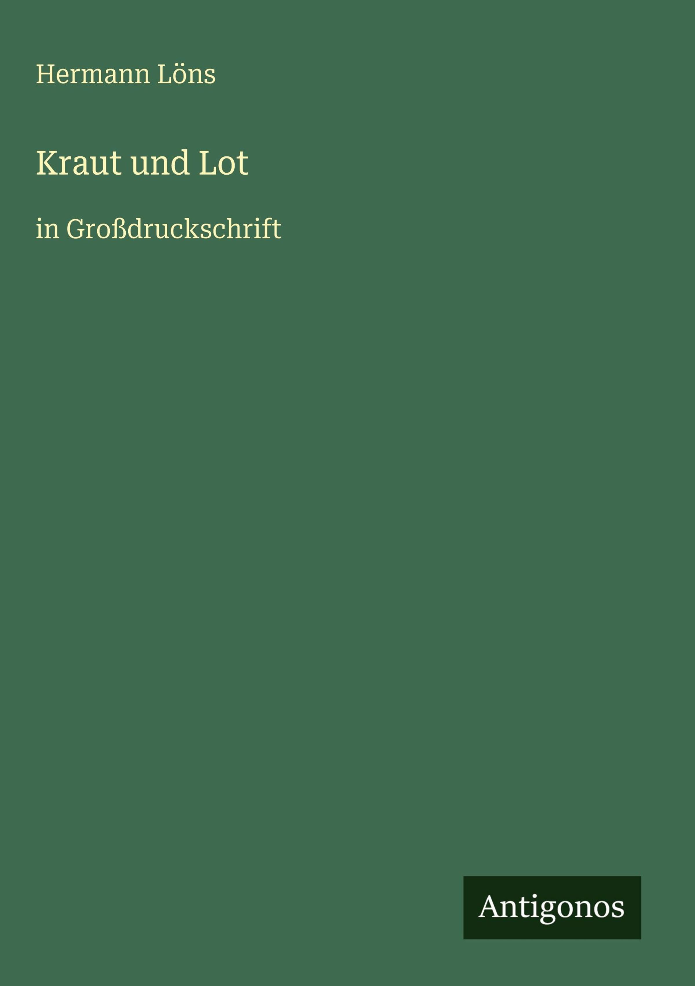 „Hermann Löns, Kraut und Lot, in Großdruckschrift.“ Unten rechts ein Logo: Antigonos. Dunkelgrüner Hintergrund., Buch