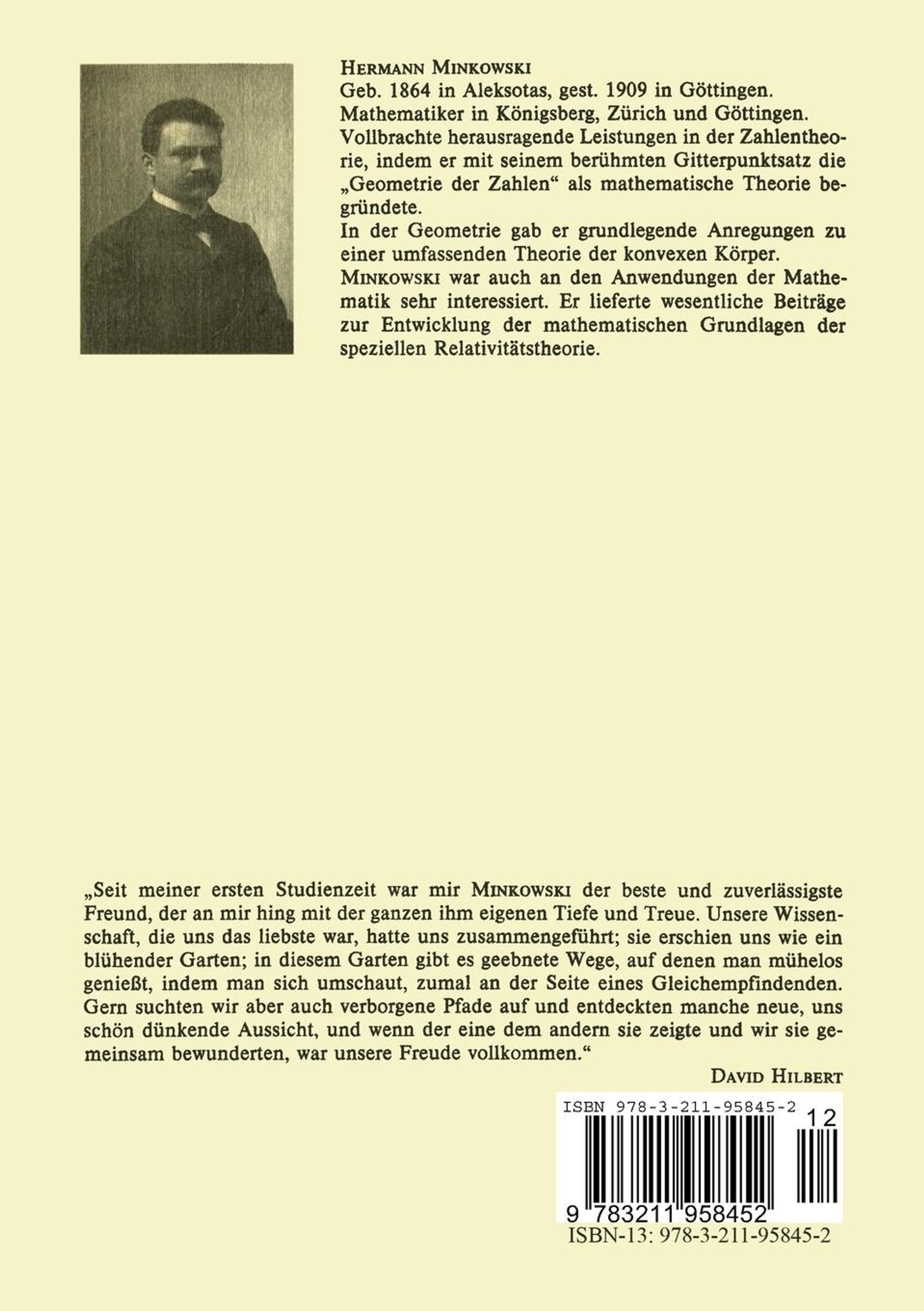Dieses dem 125. Geburtstag H. Minkowskis gewidmete Buch enthält neben fotomechanischen Nachdrucken seiner wichtigsten Arbeiten Fotos und einige Briefe. Beigefügt ist auch D. Hilberts Gedächtnisrede, die den Menschen H. Minkowski in gleicher Weise würdigt wie sein wissenschaftliches Werk. Im Anhang finden sich aktuelle Anmerkungen zu den Arbeiten, zu ihren Beziehungen untereinander und zu Weiterentwicklungen der Theorien. Ein umfangreiches Literaturverzeichnis soll dem interessierten Leser Hilfe zur weiteren Orientierung sein. "Seit meiner ersten Studienzeit war mir Minkowski der beste und zuverlässigste Freund, der an mir hing mit der ganzen ihm eigenen Tiefe und Treue. Unsere Wissenschaft, die uns das liebste war, hatte uns zusammengeführt; sie erschien uns wie ein blühender Garten ... Gern suchten wir aber auch verborgene Pfade auf und entdeckten manche neue, uns schön dünkende Aussicht, und wenn der eine dem andern sie zeigte, und wir sie gemeinsam bewunderten, war unsere Freude vollkommen." David Hilbert#1