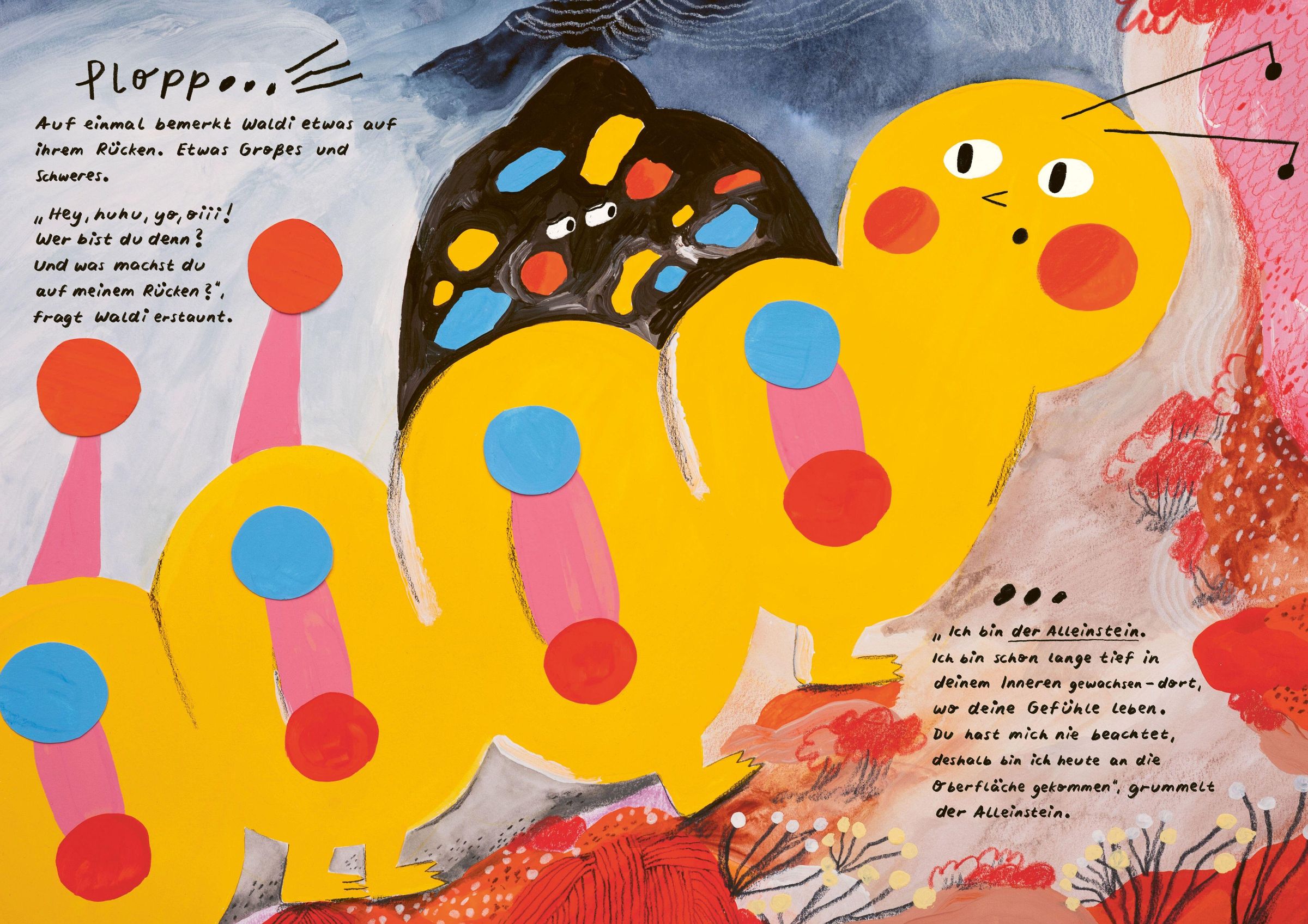 Die Raupe Waldi versteht die Welt nicht mehr. Woher kommt dieser schwere Klumpen auf ihrem Rücken, der sich selbst Alleinstein nennt?