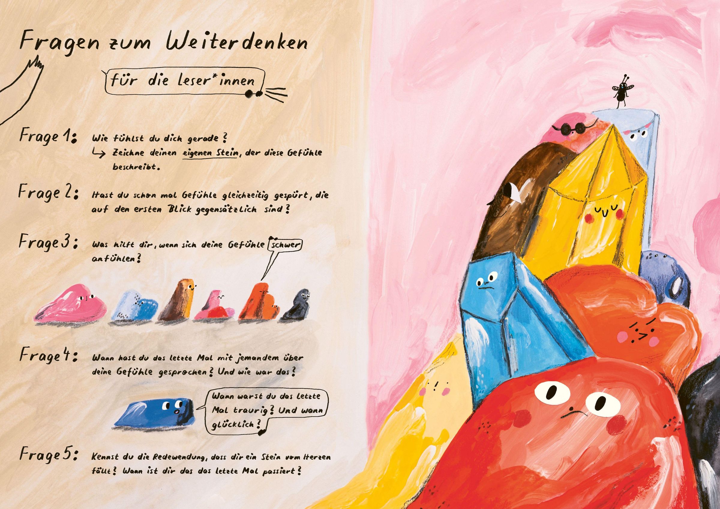 Auf ihrer Reise durch Brombeerhecken, Wälder und Wiesen trifft sie andere Tiere, die ebenfalls besondere Steine tragen. Den Neinstein, den Kleinstein, den Weinstein. Jede Begegnung erzählt von Gefühlen wie Traurigkeit, Unsicherheit oder Müdigkeit und davon, wie es leichter werden kann, wenn man diese Gefühle teilt.