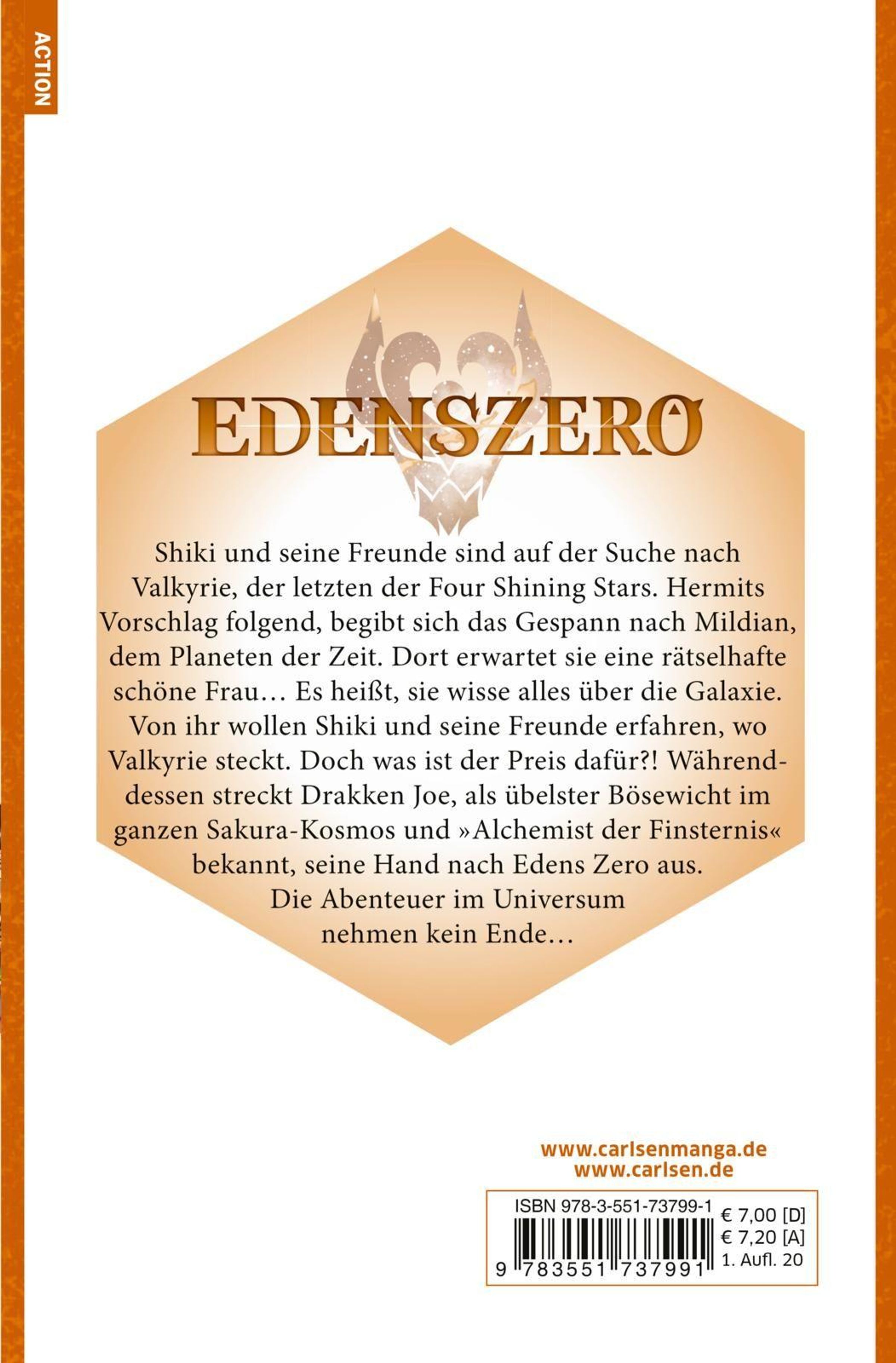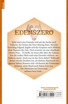 Shiki und seine Freunde sind auf der Suche nach Valkyrie, der letzten der Four Shining Stars. Hermits Vorschlag folgend, begibt sich das Gespann nach Mildian, dem Planeten der Zeit. Dort erwartet sie eine rätselhafte schöne Frau... Es heißt, sie wisse alles über die Galaxie. Von ihr wollen Shiki und seine Freunde erfahren, wo Valkyrie steckt. Doch was ist der Preis dafür?! Währenddessen streckt Drakken Joe, als übelster Bösewicht im ganzen Sakura-Kosmos und >>Alchemist der Finsternis<< bekannt, seine Hand nach Edens Zero aus. Die Abenteuer im Universum nehmen kein Ende... Was Shiki und seine Freunde erwartet, ist vollkommen unvorhersehbar!
