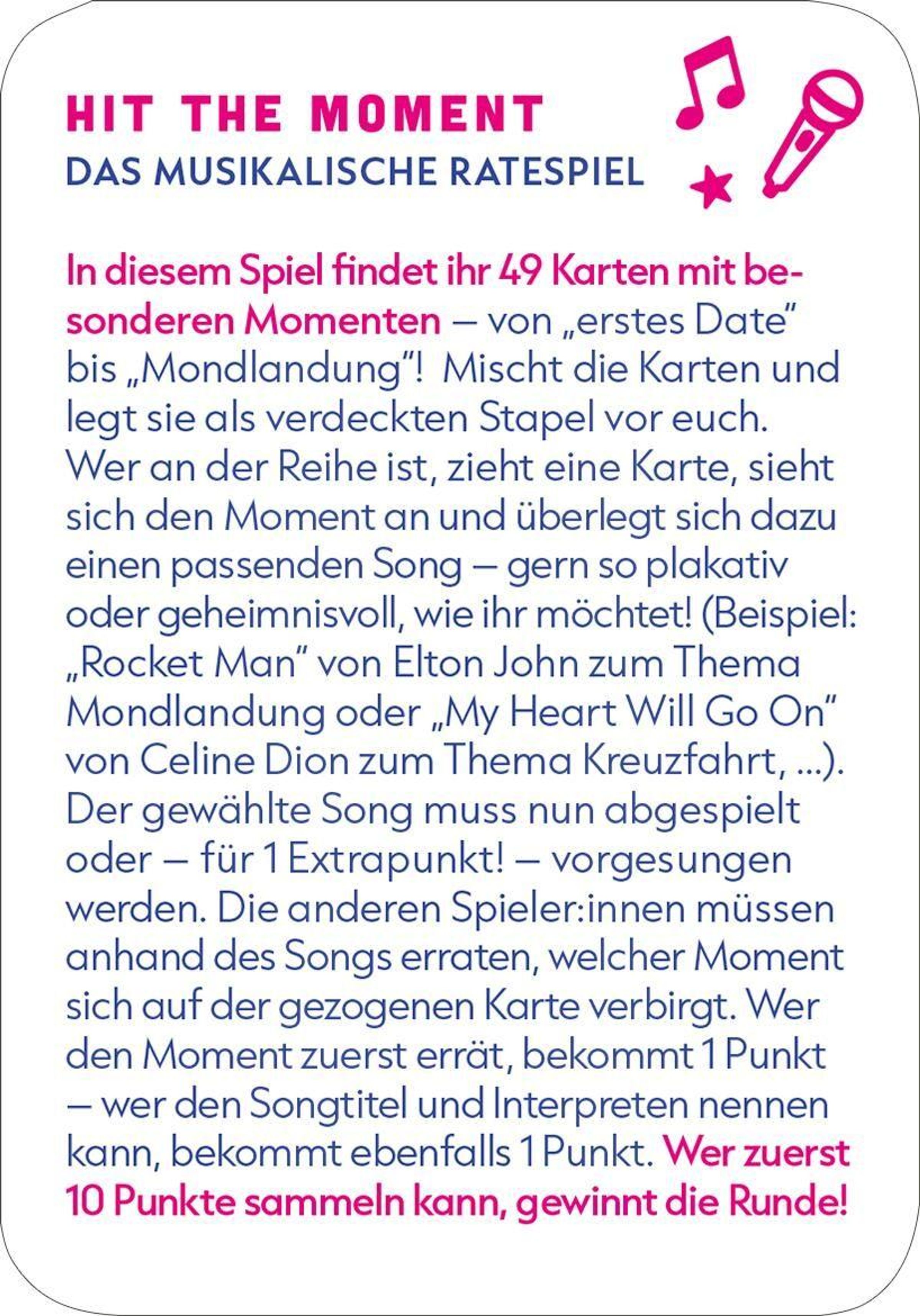 In diesem kreativen Musik-Ratespiel bekommt ihr ein Thema oder einen Moment vorgegeben - und müsst dazu den perfekten Song finden! Ob Roadtrip, erstes Date, Mondlandung oder Poolparty: Singt euren Hit vor oder spielt ihn ab, während die Gruppe versucht, den gesuchten Moment zu erraten. Ein absoluter Stimmungsmacher und das ideale Geschenk für alle Musikfans!