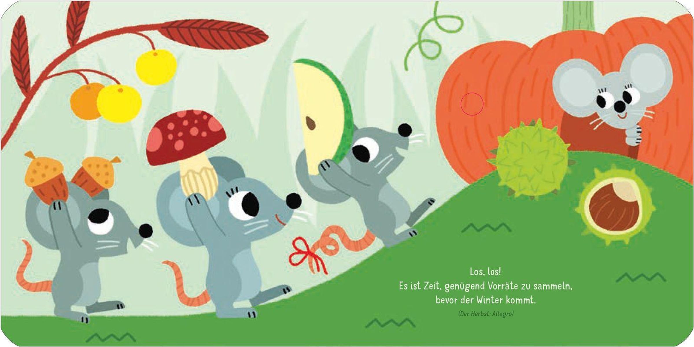 "Hörst du 'Die vier Jahreszeiten'? Vivaldi." Illustration mit drei Mäusen, einer Eule und einem Marienkäfer., Buch