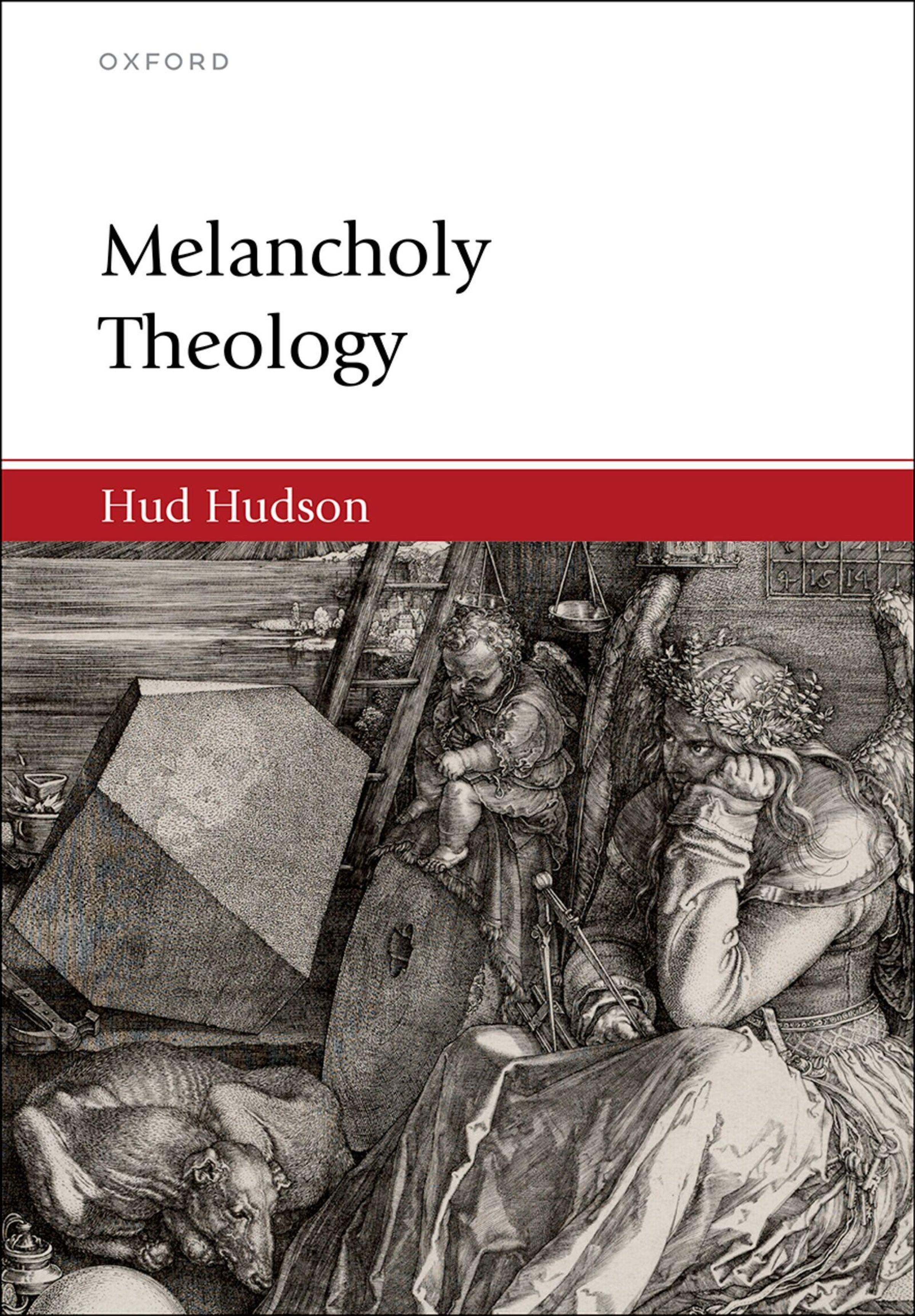 "Melancholy Theology" von Hud Hudson. Illustration zeigt eine nachdenkliche Person mit Flügeln, einem Würfel und einem schlafenden Hund., Buch