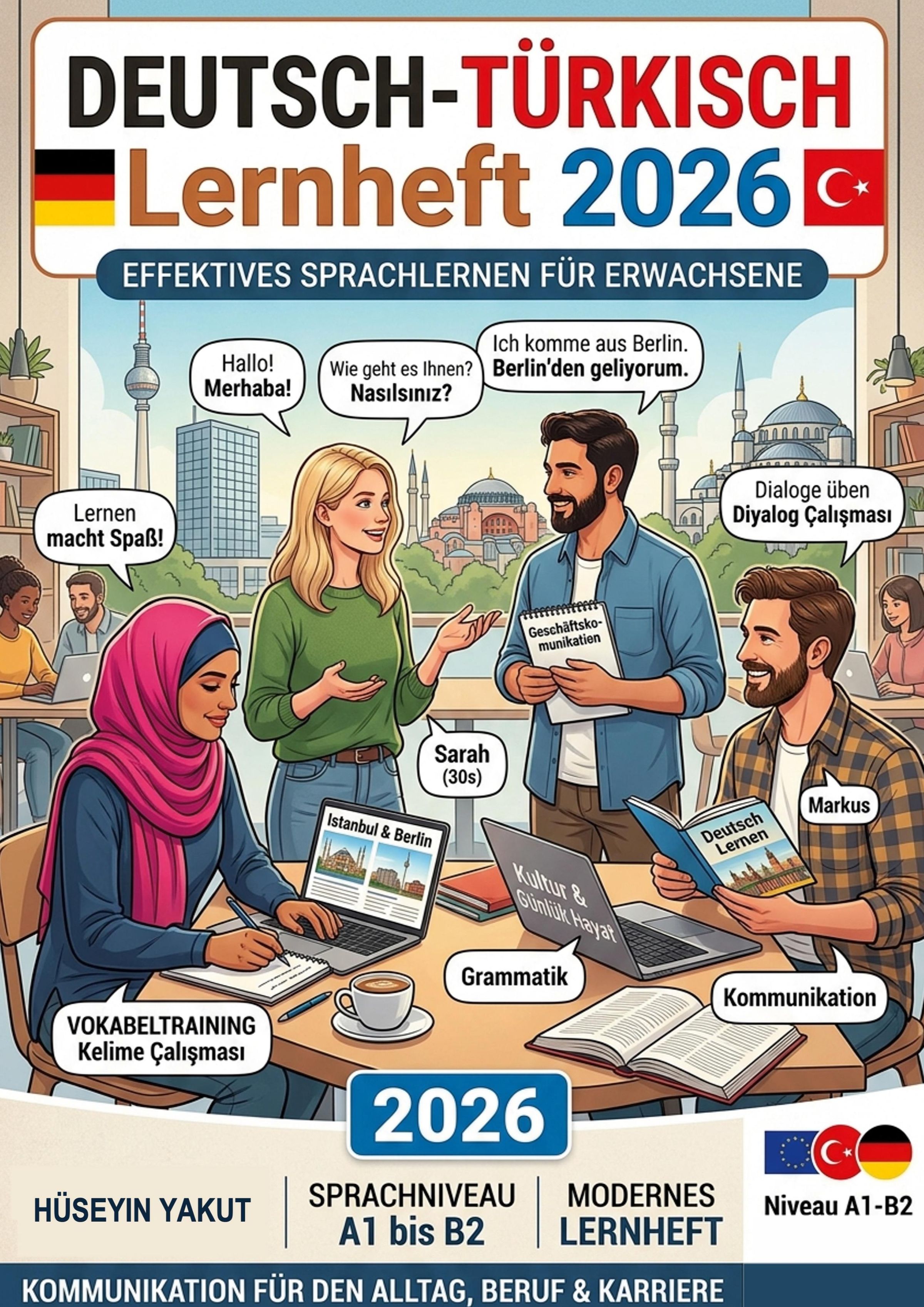 Ein Lernheft für Deutsch-Türkisch mit Dialogen, Büchern und Figuren in einer Café-Szene. Thema: Sprachlernen 2026., Buch
