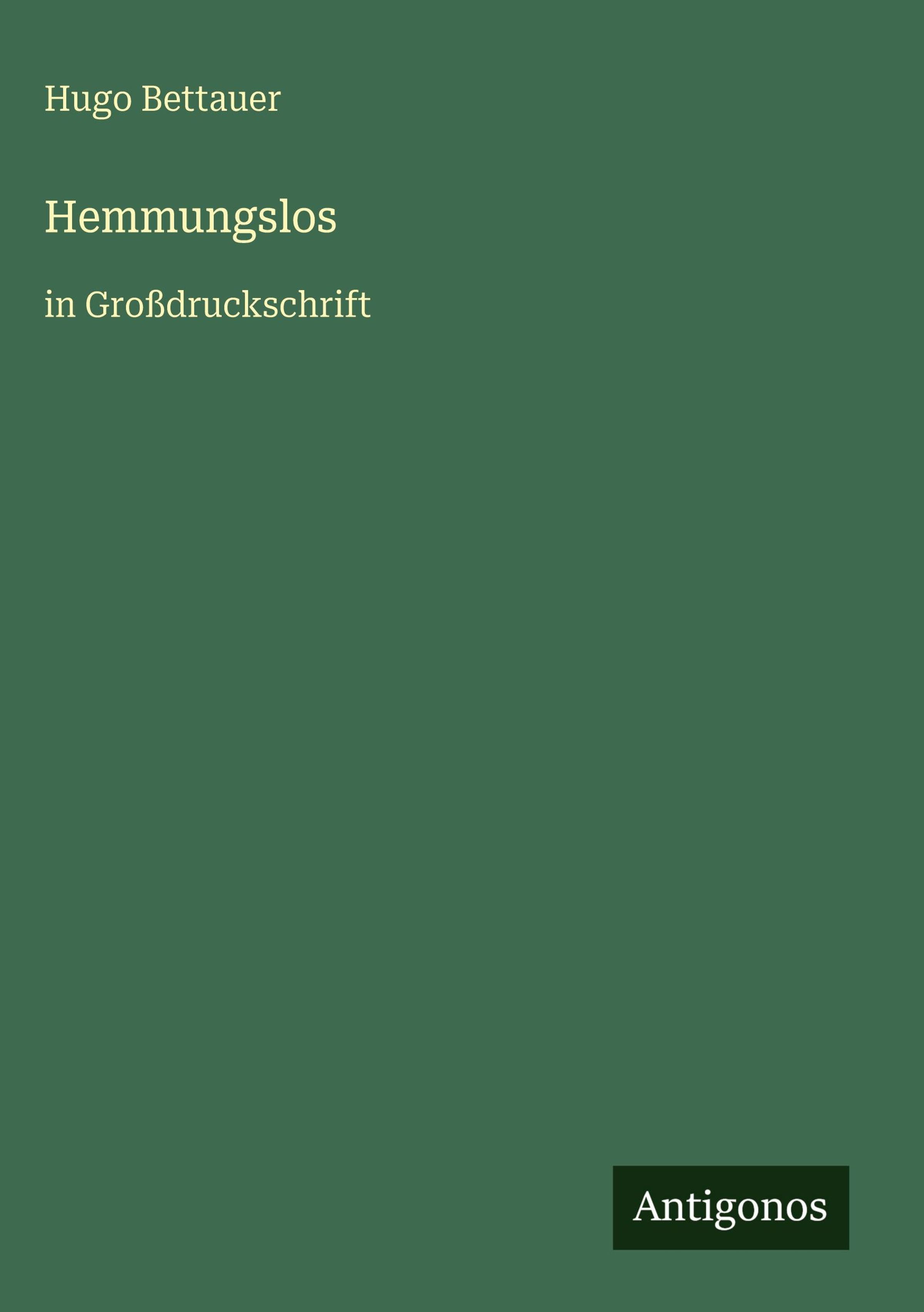 "Hugo Bettauer. Hemmungslos in Großdruckschrift" steht oben. Grüner Hintergrund mit kleinem, schwarzen Antigonos-Logo unten., Buch