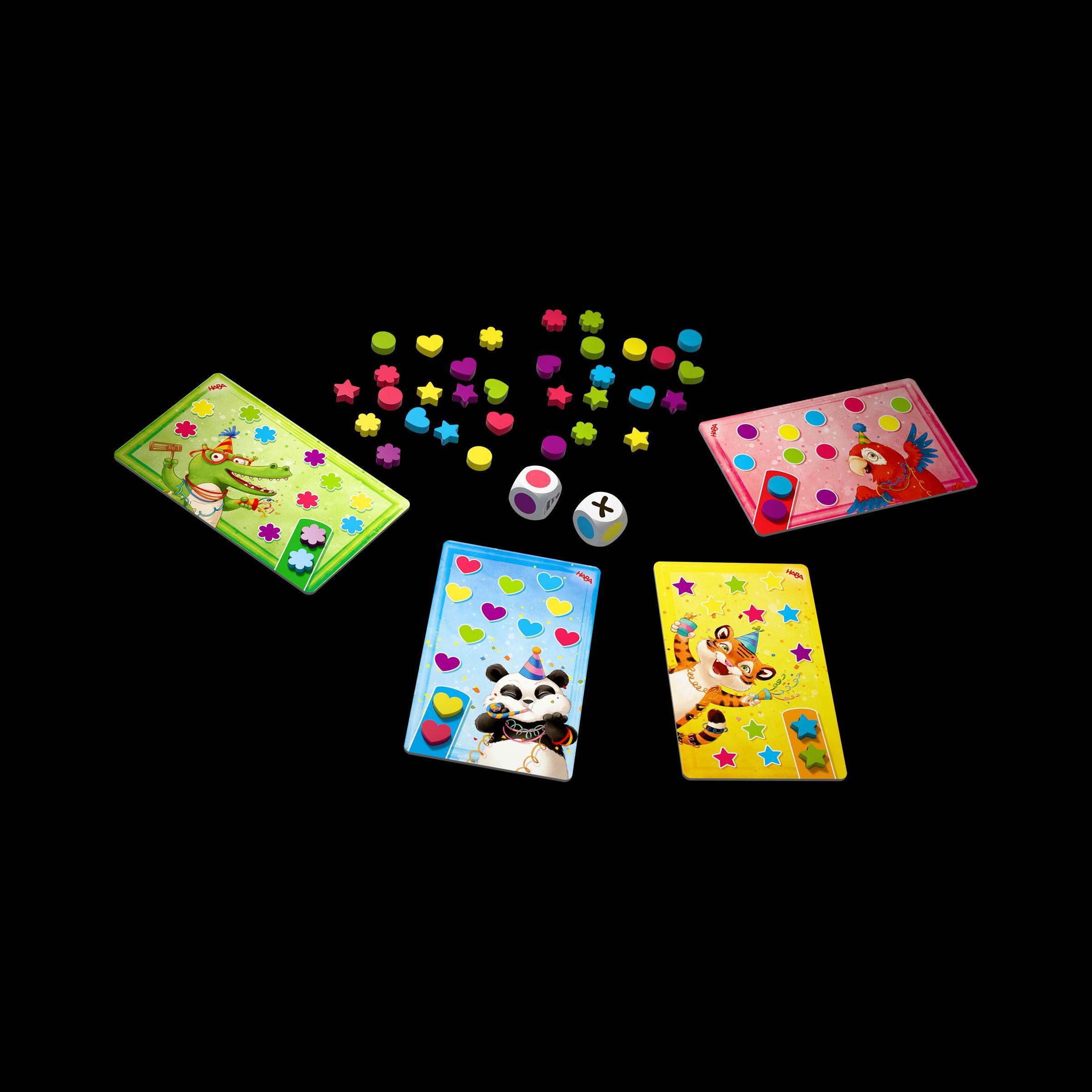 Was braucht man für eine tolle Party? Natürlich ganz viel buntes Konfetti, denn das sorgt für gute Laune. Panda, Krokodil & Co. haben mit ihren Konfettikanonen richtig Spaß. Wer mit etwas Würfelglück zuerst das bunte Konfetti um sein Tier verstreut, gewinnt.
