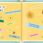 „ICH BIN 1. KLASSE!“ in bunten Buchstaben auf türkisfarbenem Hintergrund mit fröhlicher Sonne und Mustern., Buch