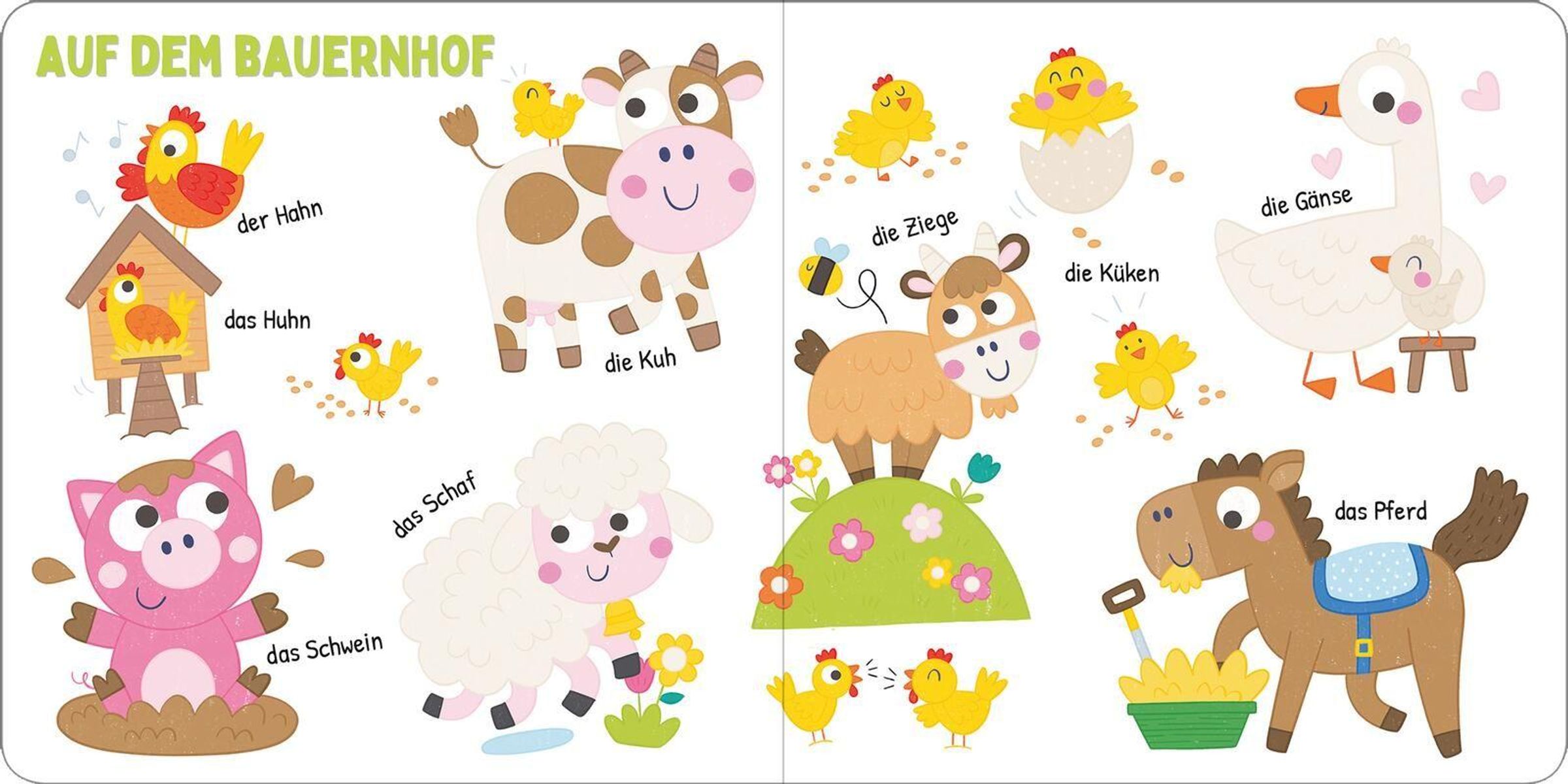 Kunterbunte Bilder laden zum Entdecken und Benennen der unterschiedlichsten Tiere ein. So wird das Sprechenlernen zum Kinderspiel, erste Erfolgserlebnisse sind garantiert.