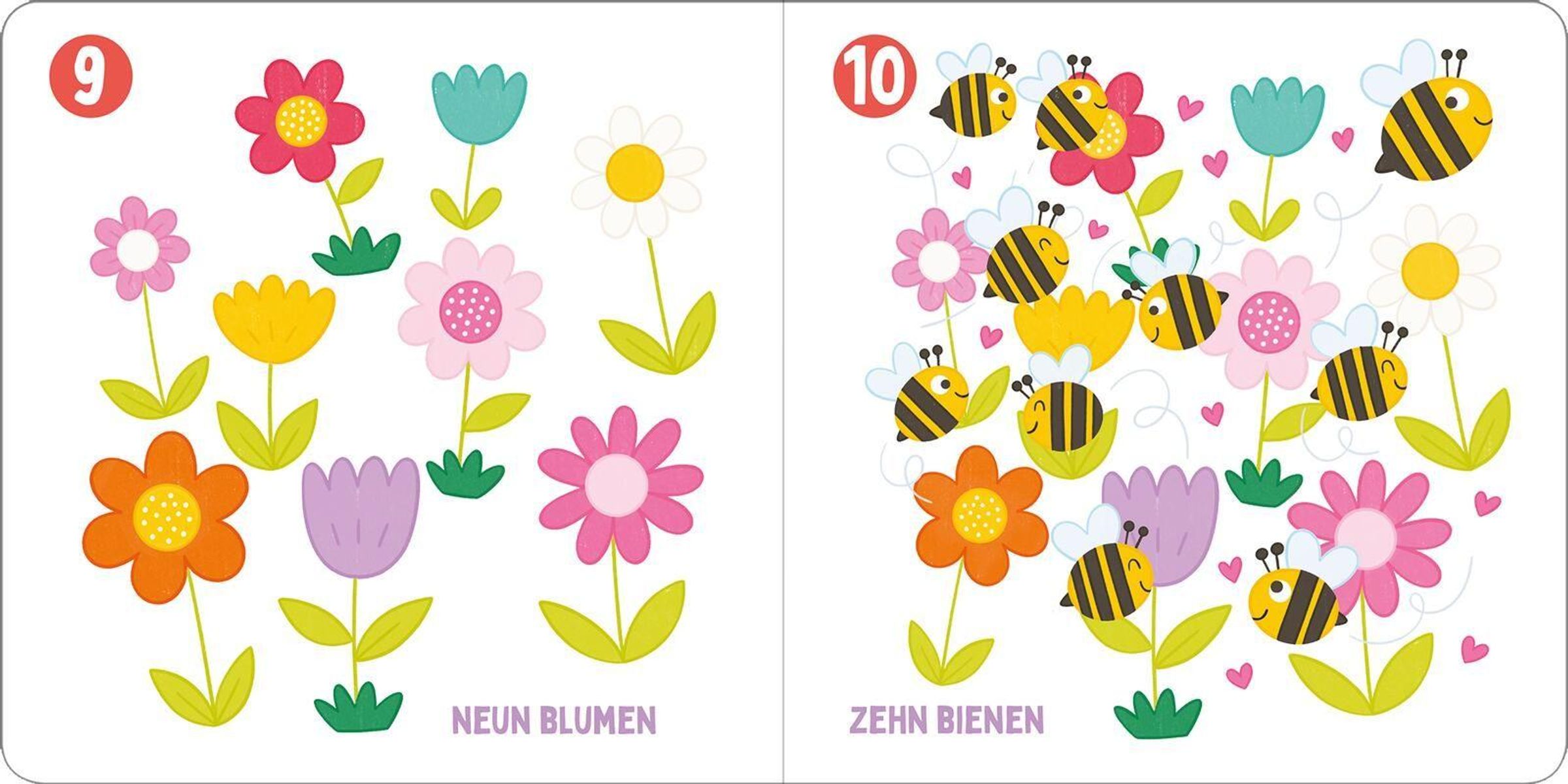 2 Katzen, 4 Vögel, 6 Blätter - und wie viele Bienen kannst du zählen? Schau doch mal! Kunterbunte Bilder laden zum Entdecken und Zählen ein. So wird der Zahlenraum bis 10 zum Kinderspiel, erste Erfolgserlebnisse sind garantiert.