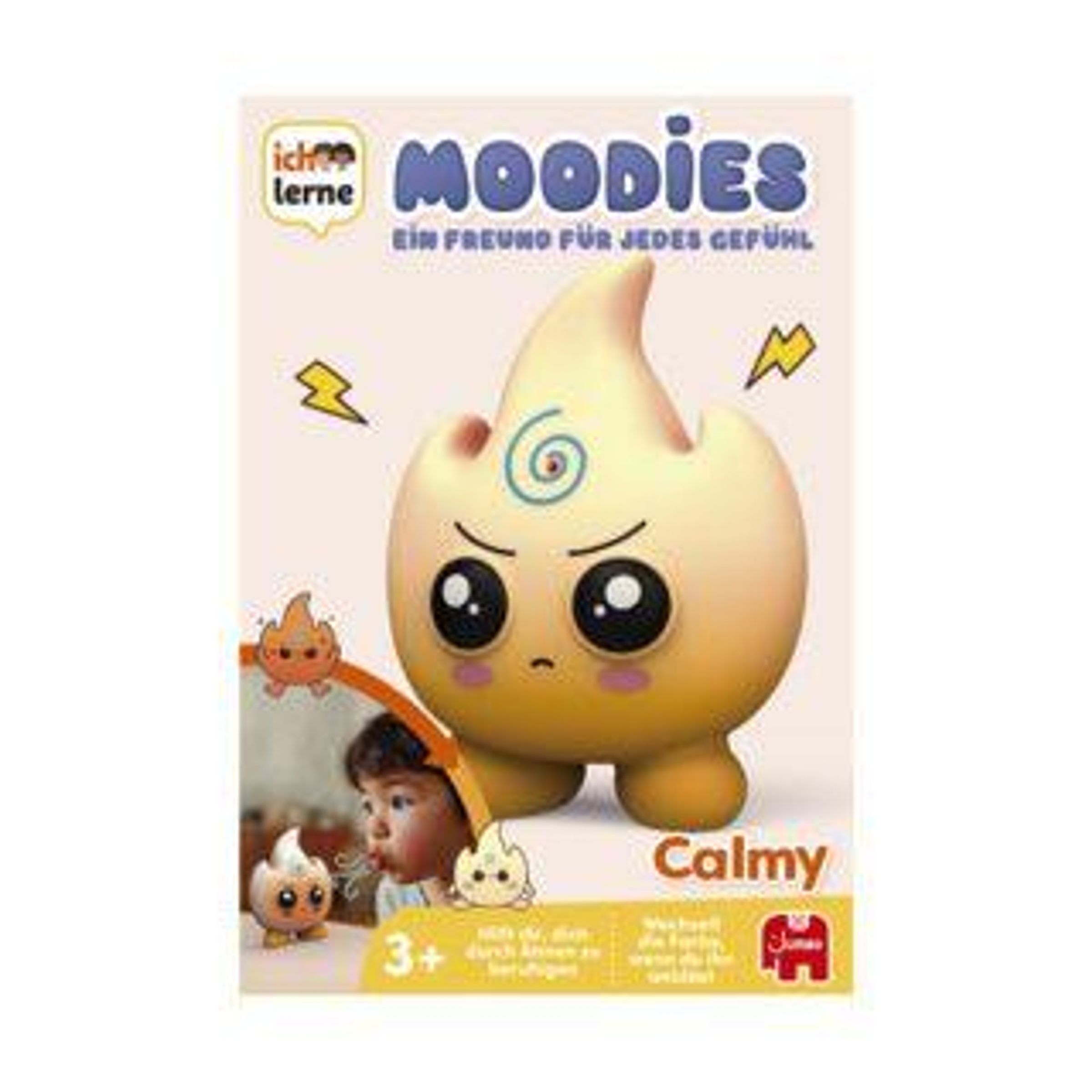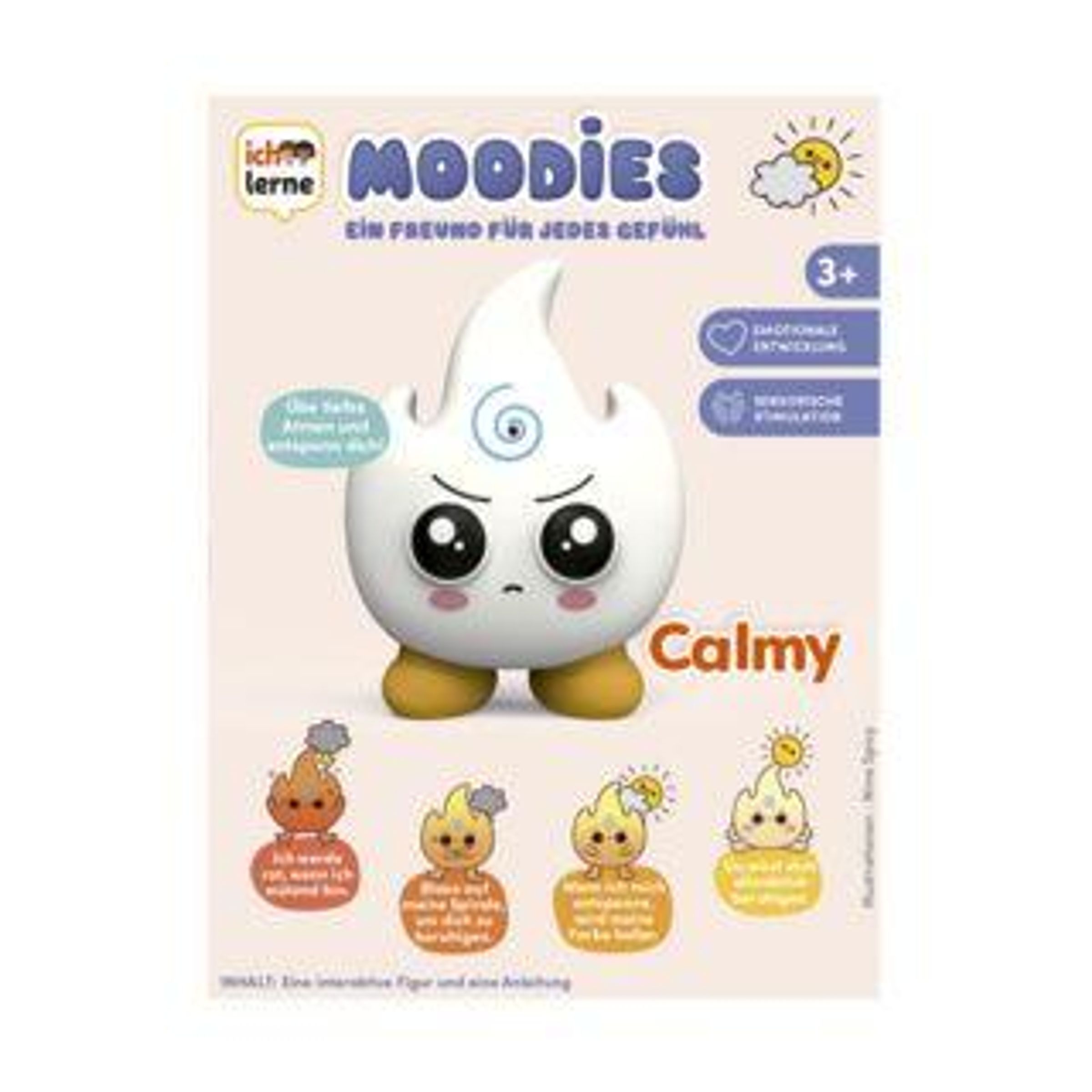 Auf der Verpackung steht: "Moodies - Ein Freund für jedes Gefühl - Calmy". 3+ Jahre. Ein gelbes, flammenförmiges Wesen mit Gesicht., Spiele