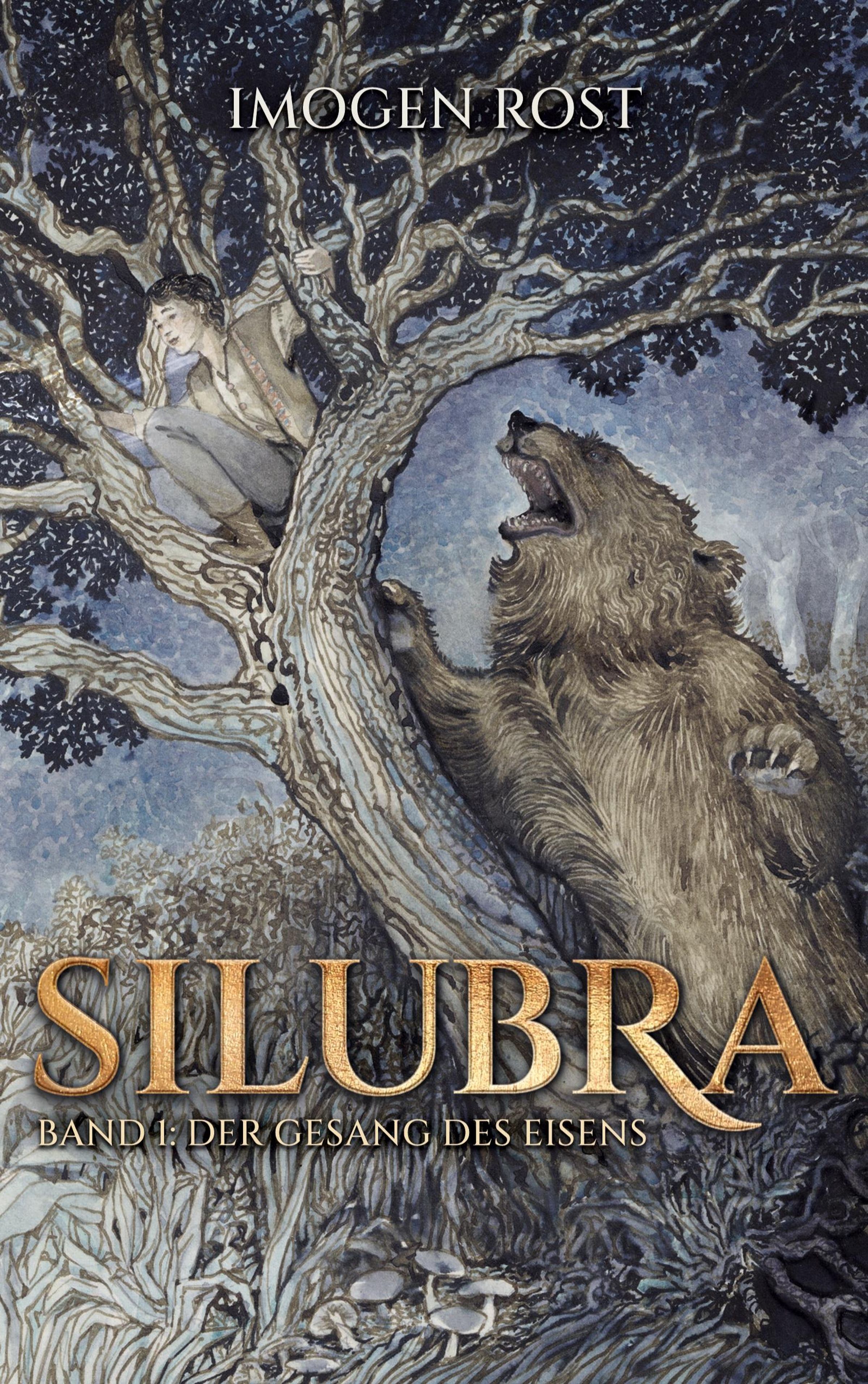 „Imogen Rost, Silubra, Band 1: Der Gesang des Eisens“. Illustration: Junge im Baum, brüllender Bär unten., Buch