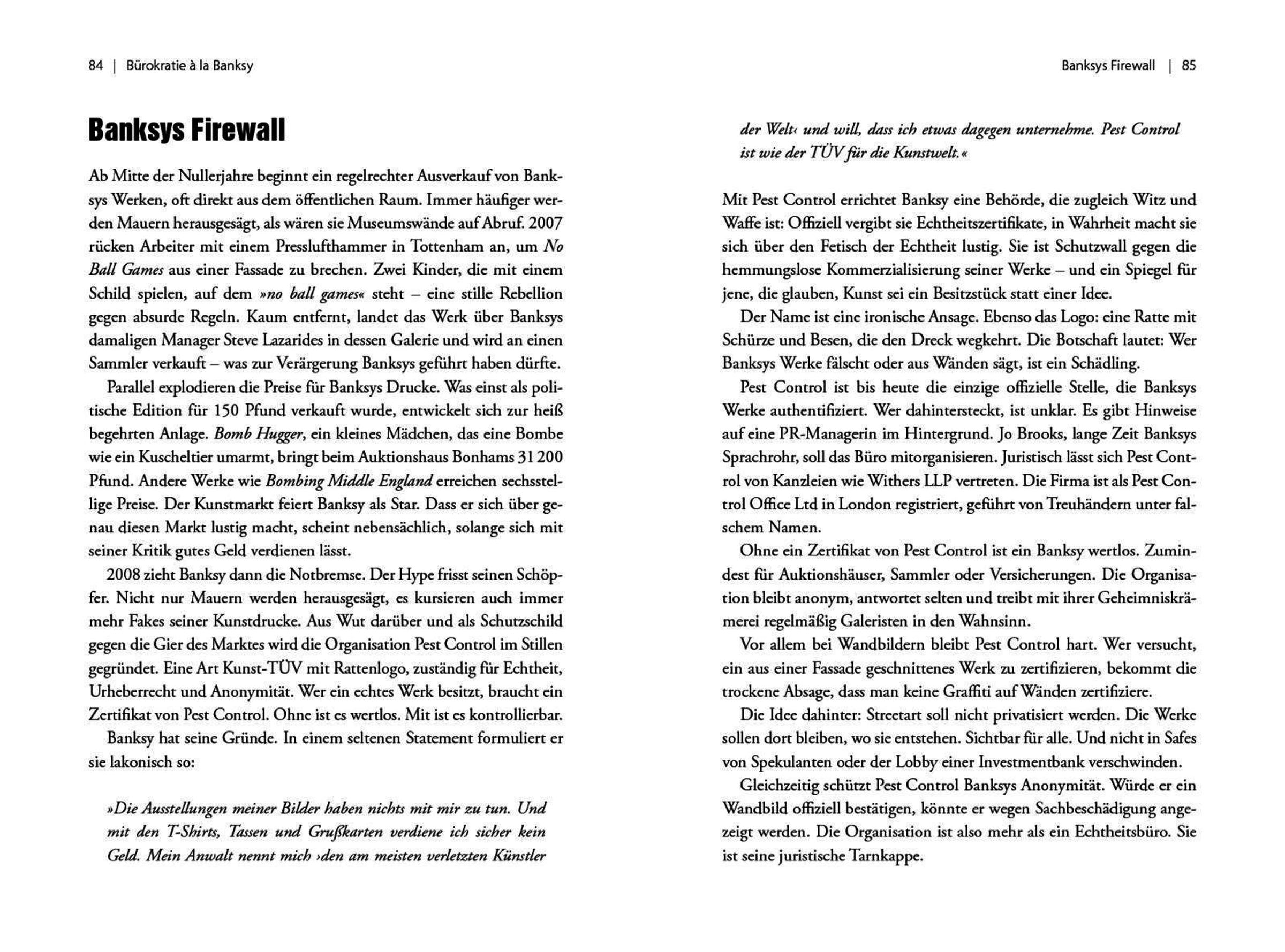 Banksy wurde 1974 in Bristol geboren. Oder 1973 in Yate? Wirklich gesicherte Fakten zu seiner Person gibt es wenige. Dennoch verdichten sich neue Hinweise zu einem immer schärferen Bild eines Mannes, der vor allem eines sein will: politischer Aktivist. Von seinen Wurzeln in der Underground-Szene Bristols bis zu spektakulärsten Kunstaktionen in der Westbank, in Disneyland oder in der Ukraine. Obwohl - oder gerade weil - er nicht persönlich in Erscheinung tritt und dadurch die ganze Aufmerksamkeit auf seine Werke richtet, gilt Banksy heute als einer der einflussreichsten Streetart-Künstler der Welt, als Pionier und subversiver Visionär innerhalb dieser Kunstform. Mit seinem Humor, seiner politischen Satire und seiner Kritik am Kunstmarkt hält er der Gesellschaft den Spiegel vor.