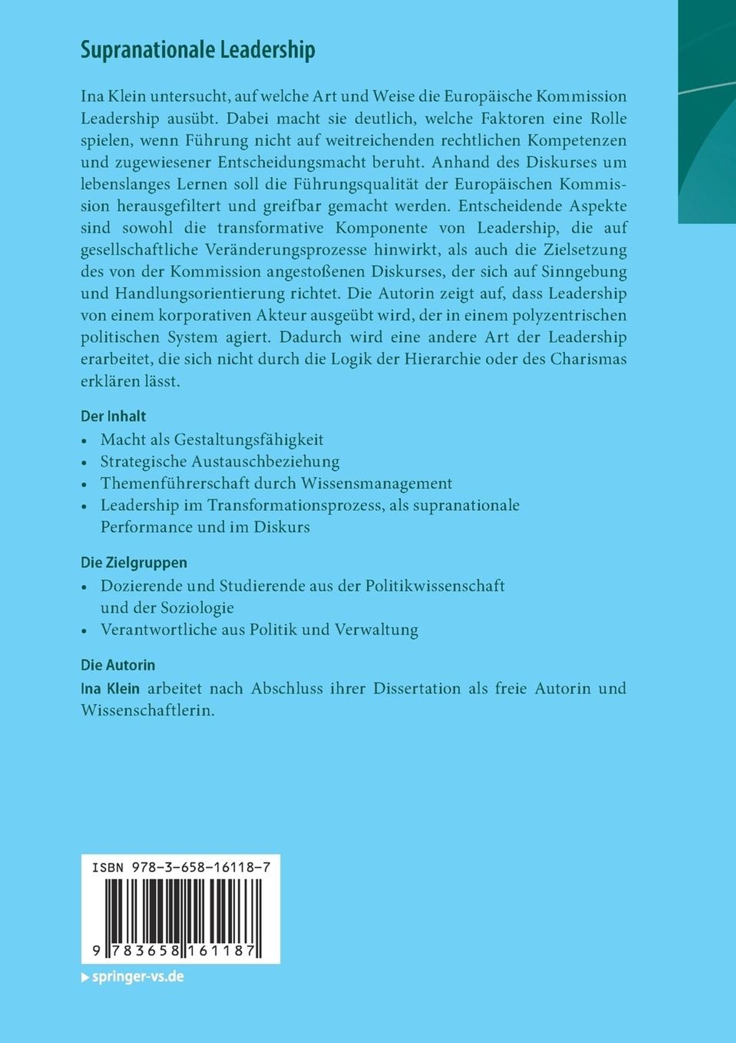 Ina Klein untersucht, auf welche Art und Weise die Europäische Kommission Leadership ausübt. Dabei macht sie deutlich, welche Faktoren eine Rolle spielen, wenn Führung nicht auf weitreichenden rechtlichen Kompetenzen und zugewiesener Entscheidungsmacht beruht. Anhand des Diskurses um lebenslanges Lernen soll die Führungsqualität der Europäischen Kommission herausgefiltert und greifbar gemacht werden. Entscheidende Aspekte sind sowohl die transformative Komponente von Leadership, die auf gesellschaftliche Veränderungsprozesse hinwirkt, als auch die Zielsetzung des von der Kommission angestoßenen Diskurses, der sich auf Sinngebung und Handlungsorientierung richtet. Die Autorin zeigt auf, dass Leadership von einem korporativen Akteur ausgeübt wird, der in einem polyzentrischen politischen System agiert. Dadurch wird eine andere Art der Leadership erarbeitet, die sich nicht durch die Logik der Hierarchie oder des Charismas erklären lässt.