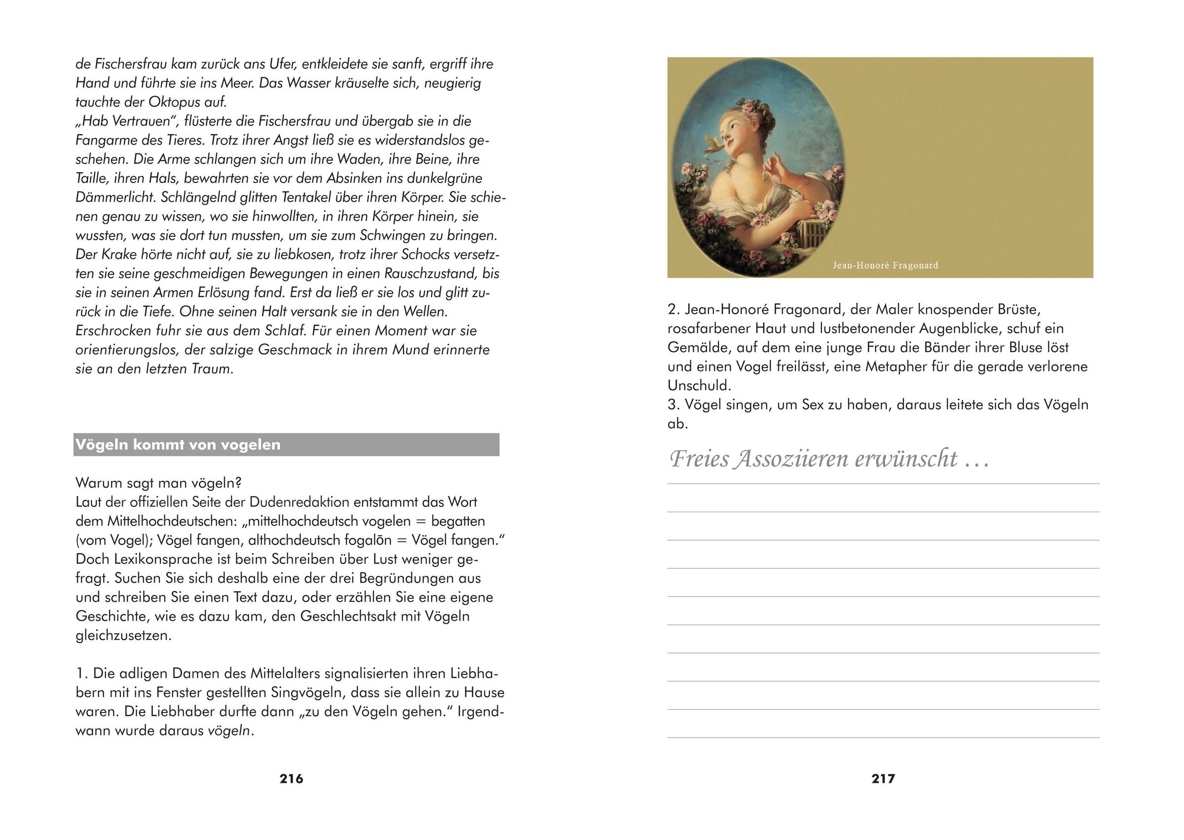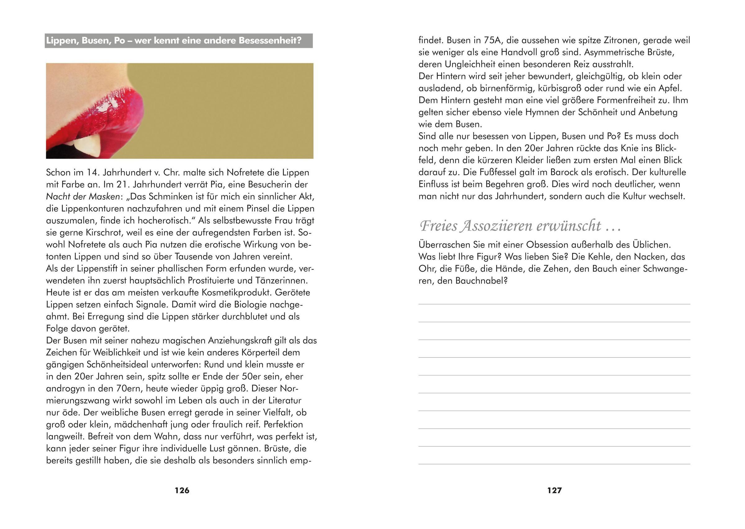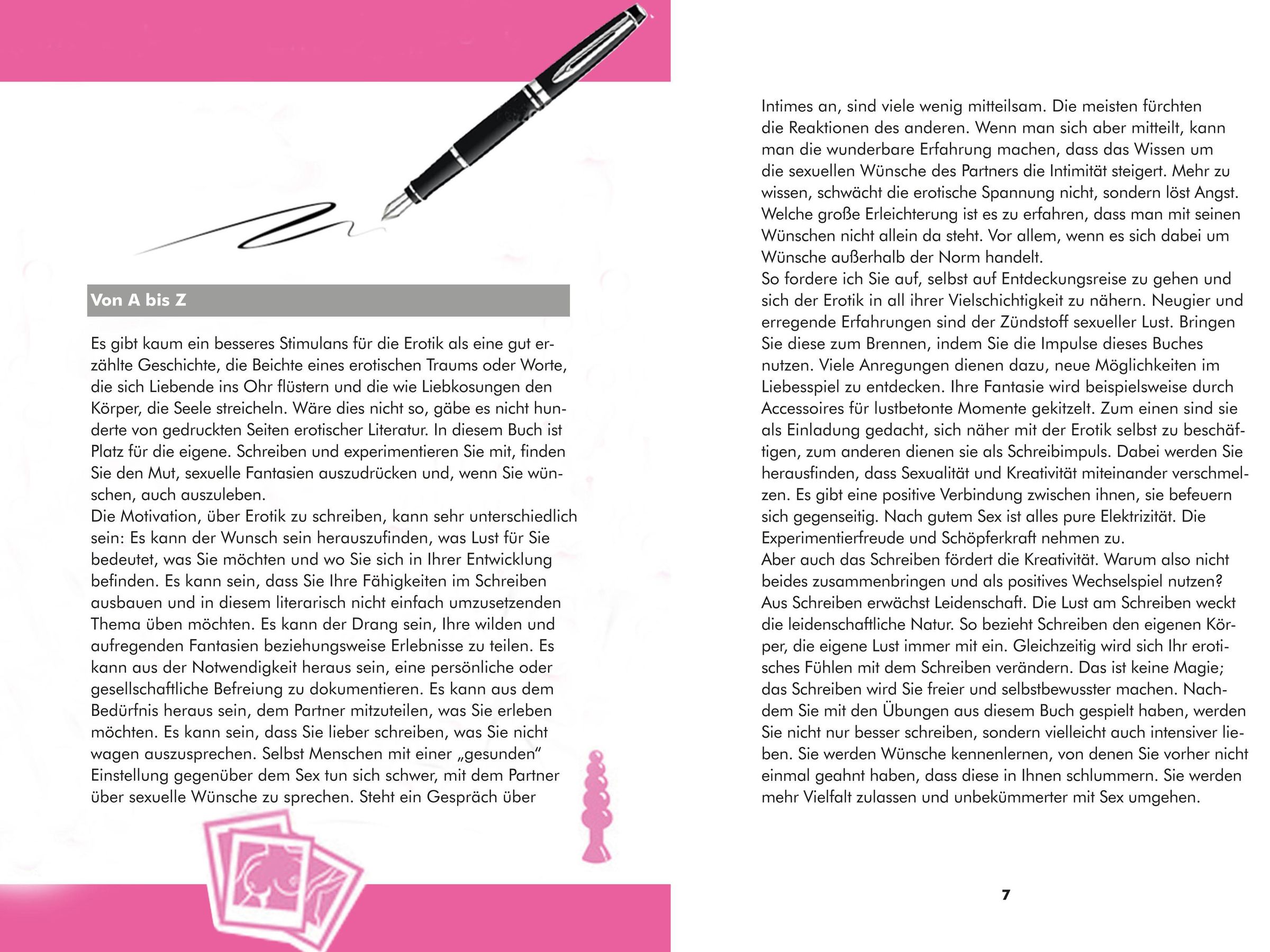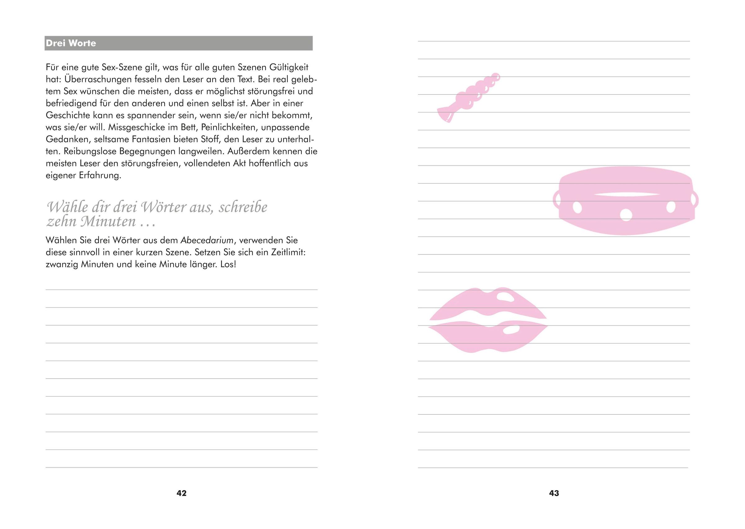 Das unterhaltende Sachbuch bringt zwei elementare Bedürfnisse des Menschen zusammen: Erotik und Schreiben. Sexualität und Kreaivität befeuern sich gegenseitig. Zwei Kulturtechniken, die die Menschheit vorangebracht haben. Über 50 Vorschläge, wie man Zugang zur eigenen Erotik und zum erotischen Schreiben findet, sowie Textbeispiele, Grundlagenwissen für Schreibende und viele Übungen: für einzelne Szenen, Dialoge oder eine ganze Geschichte mit Spannungsaufbau. Die Überschriften der Kapitel sind in einem klassischen Schreibspiel, dem Abecedarium, entstanden. Passend zu den Stichwörtern findet sich Wissenswertes zu Erotik und Sexualität und zur Geschichte erotischer Kunst und Literatur. Bildelemente und die Übungen mit Seiten oder Lücken zum Ausfüllen, wie ein Tagebuch, so können Sie ins Buch hineinschreiben, Schreibaufgaben lösen, ein Spiel mit Partner*in: die ausgefüllten Bücher austauschen ...