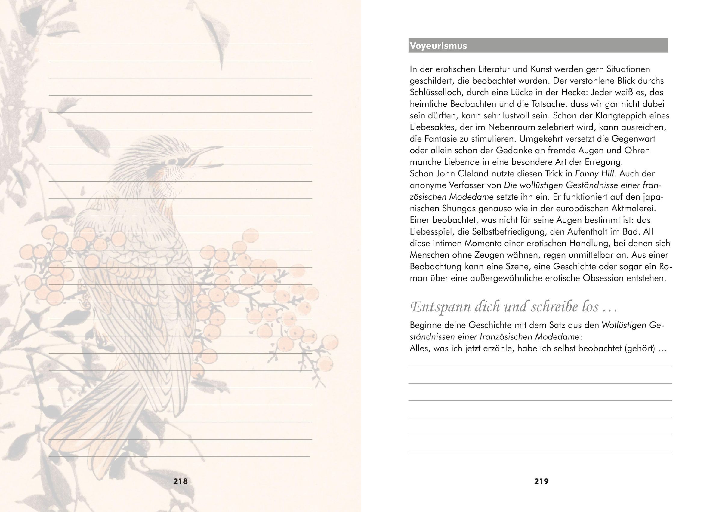 "Erotisches Schreiben ist nicht möglich, ohne erotisch zu fühlen, es bezieht den eigenen Körper immer mit ein. Umgekehrt gibt es kaum ein besseres Stimulans für die Erotik als eine gut erzählte Geschichte, die Beichte eines erotischen Traums oder Worte, die sich Liebende ins Ohr flüstern."