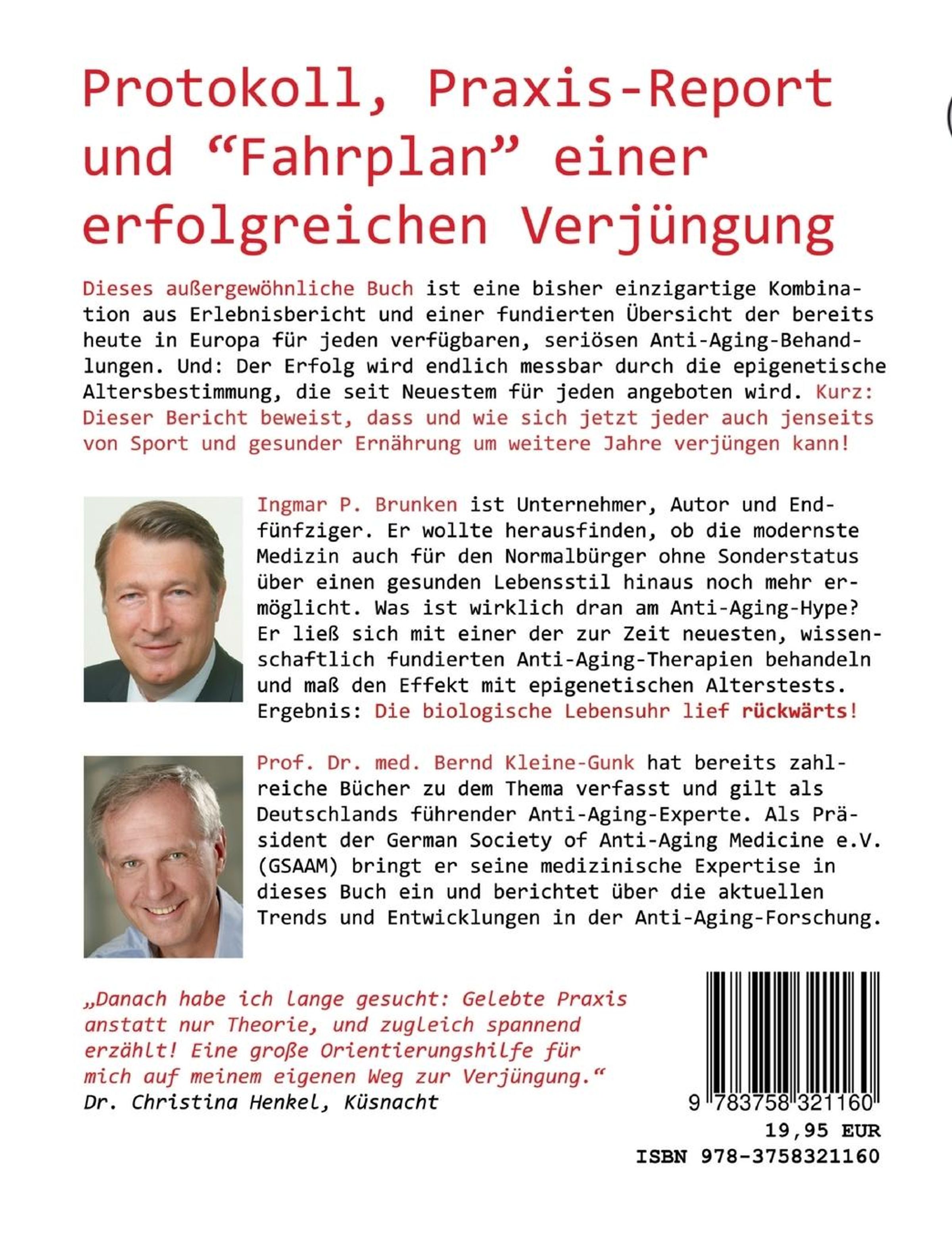 Dieses außergewöhnliche Buch ist eine bisher einzigartige Kombination aus Praxisbericht und einer fundierten Übersicht der bereits heute in Europa für jeden verfügbaren, seriösen Anti-Aging-Behandlungen. Und: Der Erfolg wird endlich messbar durch die epigenetische Altersbestimmung, die seit Neuestem für jeden angeboten wird. Kurz: Dieser Bericht beweist, dass und wie sich jetzt jeder auch jenseits von Sport und gesunder Ernährung um weitere Jahre verjüngen kann!