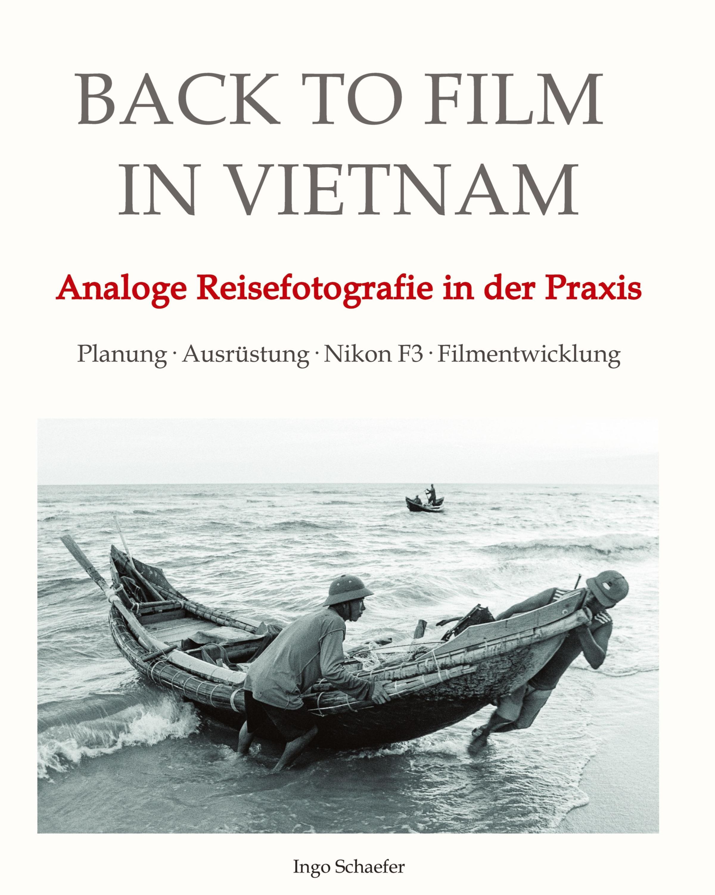 "Back to Film in Vietnam. Analoge Reisefotografie in der Praxis. Planung, Ausrüstung, Nikon F3, Filmentwicklung. Ingo Schaefer." Zwei Männer schieben ein Holzboot ins Wasser., Buch