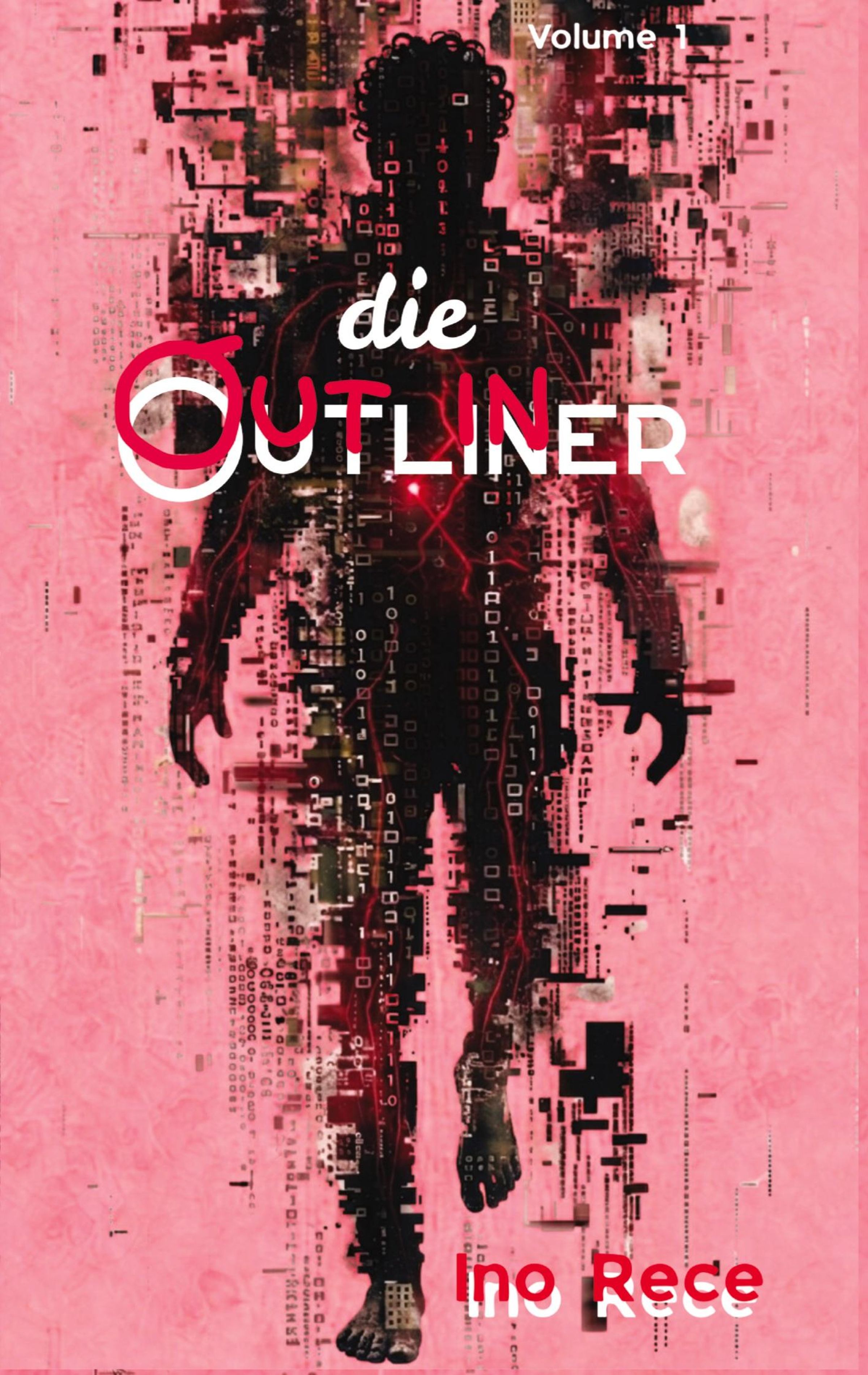Oben steht "Volume 1", darunter "die Outliner". Unten rechts "Ino Rece". Silhouette mit digitalem, pixelartigem Muster auf rosa Hintergrund., Buch