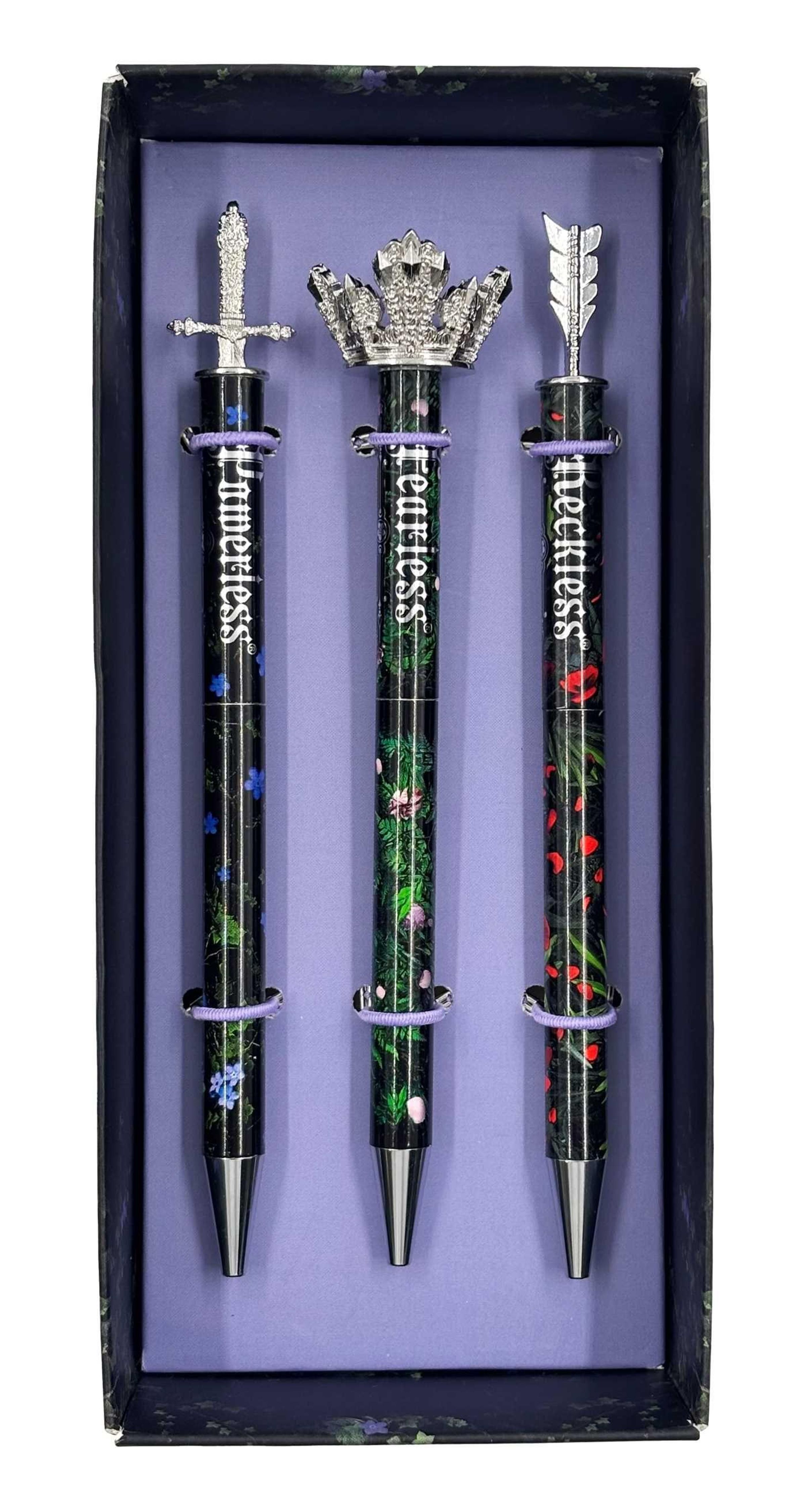 DETAILED DESIGN: This deluxe set contains three ballpoint pens with black ink and designs inspired by the Powerless , Reckless, and Fearless novels. Each pen features a detailed silver, die-cast metal topper including Paedyn's dagger, the resistance arrow, and the Fearless crown.