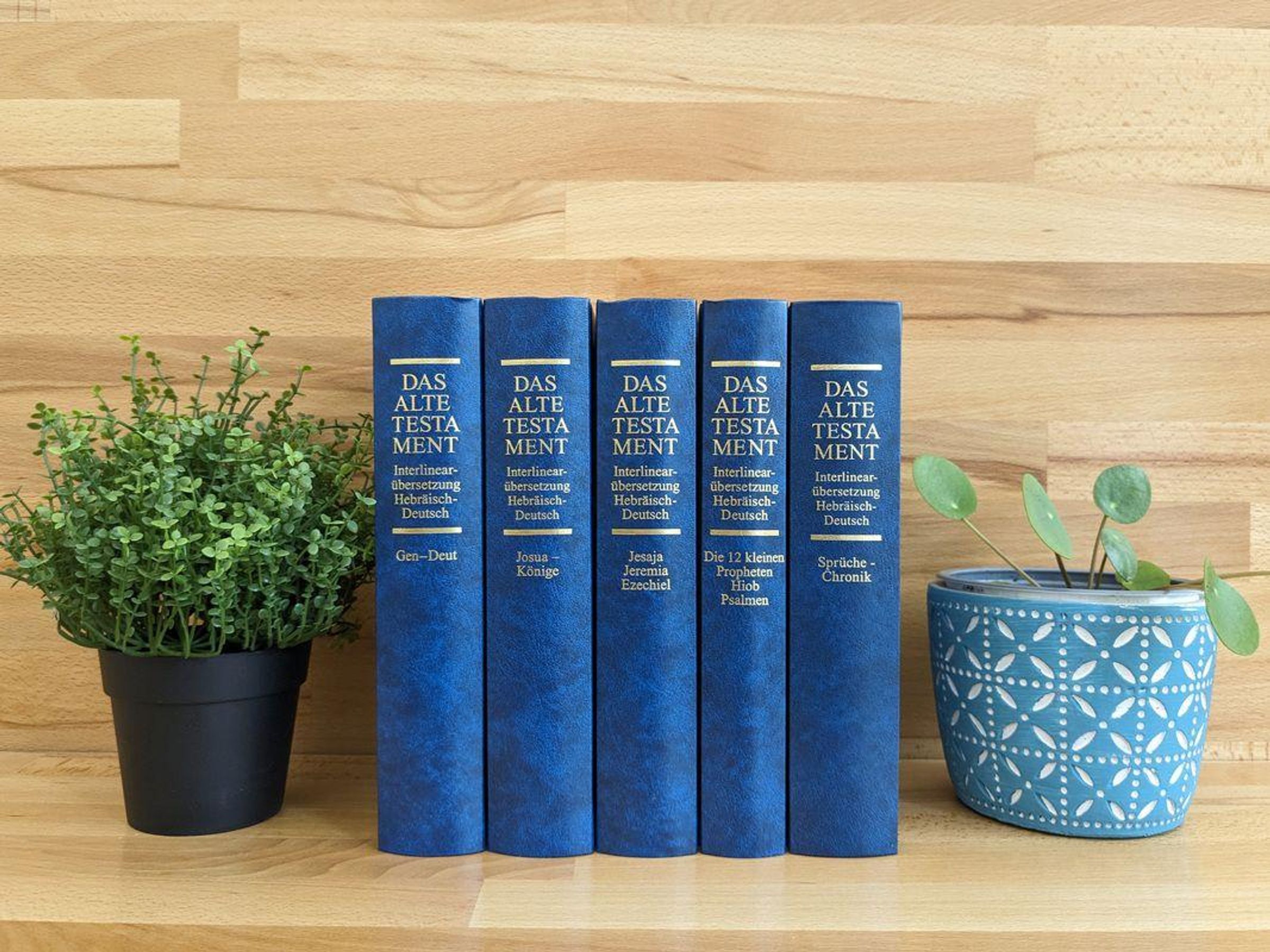 Blaue Buchrücken mit goldener Aufschrift: "Das Alte Testament", "Interlinearübersetzung Hebräisch-Deutsch"., Buch